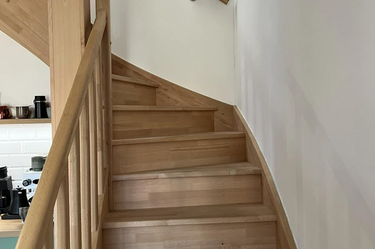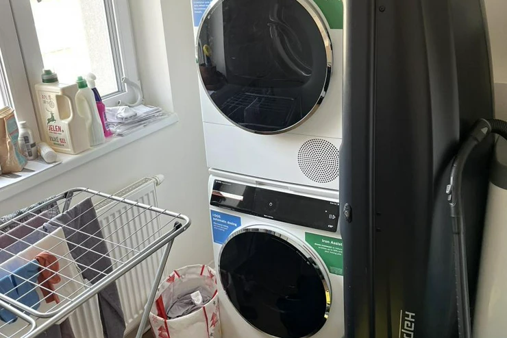 The lower level of the apartment features an entrance hall and a utility room equipped with a washing machine, dryer, and Vaillant gas boiler. The main living area consists of a cozy living room with a dining space and a fully equipped modern kitchen (dishwasher, built-in fridge/freezer, hob, oven, extractor hood).