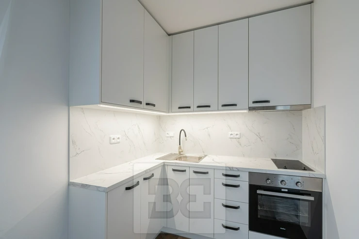 The apartment is offered unfurnished; however, it features a new kitchen unit with appliances (oven and cooktop). The kitchenette is seamlessly connected to the main living area, which is sufficiently spacious and well-lit.