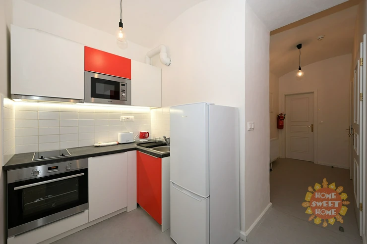 Beautiful furnished room with a total area of 10 m2 and a single bed is located in Residence Kinských on the lower groundfloor of a brick house in Kinských street, Prague 5. The house was completely renovated in 2019. The room is located in a 2 bedroom apartment with a shared kitchen with dining area, bathroom with shower and toilet. The room as well as the apartment is fully furnished, including kitchen utensils, iron, ironing board and cleaning equipment. Cleaning of the common area is already included in the rent, once a week. There is also a completely free fitness room, laundry room (coin operated) and terrace.