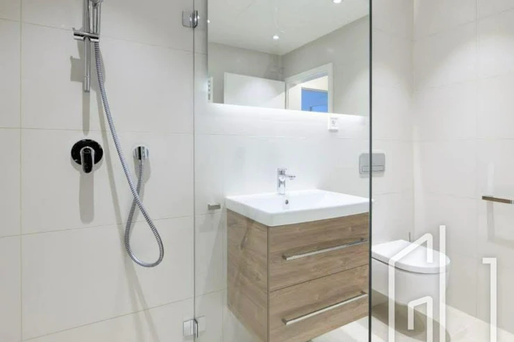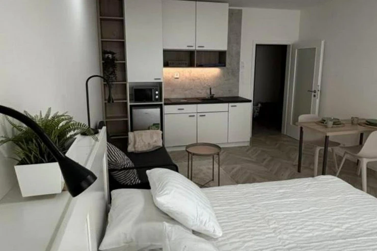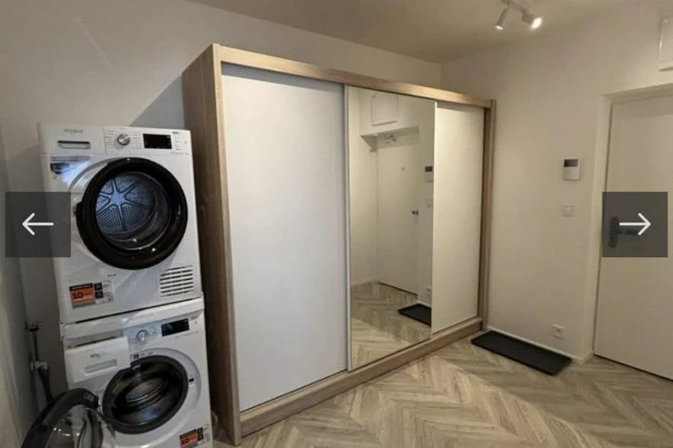Kuchyň je vybavená indukční vážnou deskou, mikrovlnnou troubou a lednici. V chodbě se nachází pračka, sušička a velká zrcadlová skříň pro dostatek úložného prostoru. V obytné části zůstává postel s uložným prostorem, stůl a TV stolek. Koupelna je moderní a disponuje prostorným walk-in sprchovým koutem. Součásti bytu je také balkon.