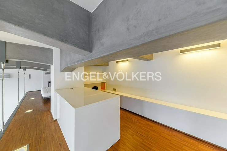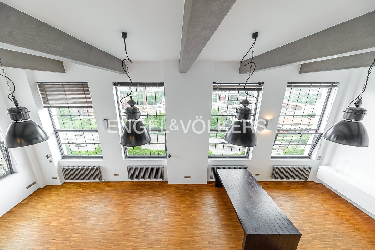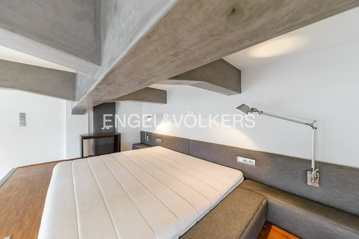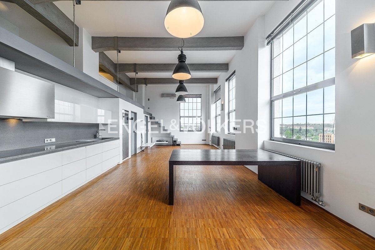 A modern loft apartment with a gallery is part of a well-known SUPERLOFTS project. Situated in an industrial building from the 1900 with a lift, the apartment has unique architecture features. High ceilings and large windows with a beautiful view of Prague. The interior of the apartment is designed as an open space with an entrance right into the living room, kitchenette fully equipped with MIELE appliances, a bathroom with a shower and a separate toilet. An open gallery can be used as a bedroom and a working space with storage options. High-standard equipment consists of a top-notch BOSE HI-FI system, AC, windows that can be opened, blinds and security doors. One parking spot is included in the rent.