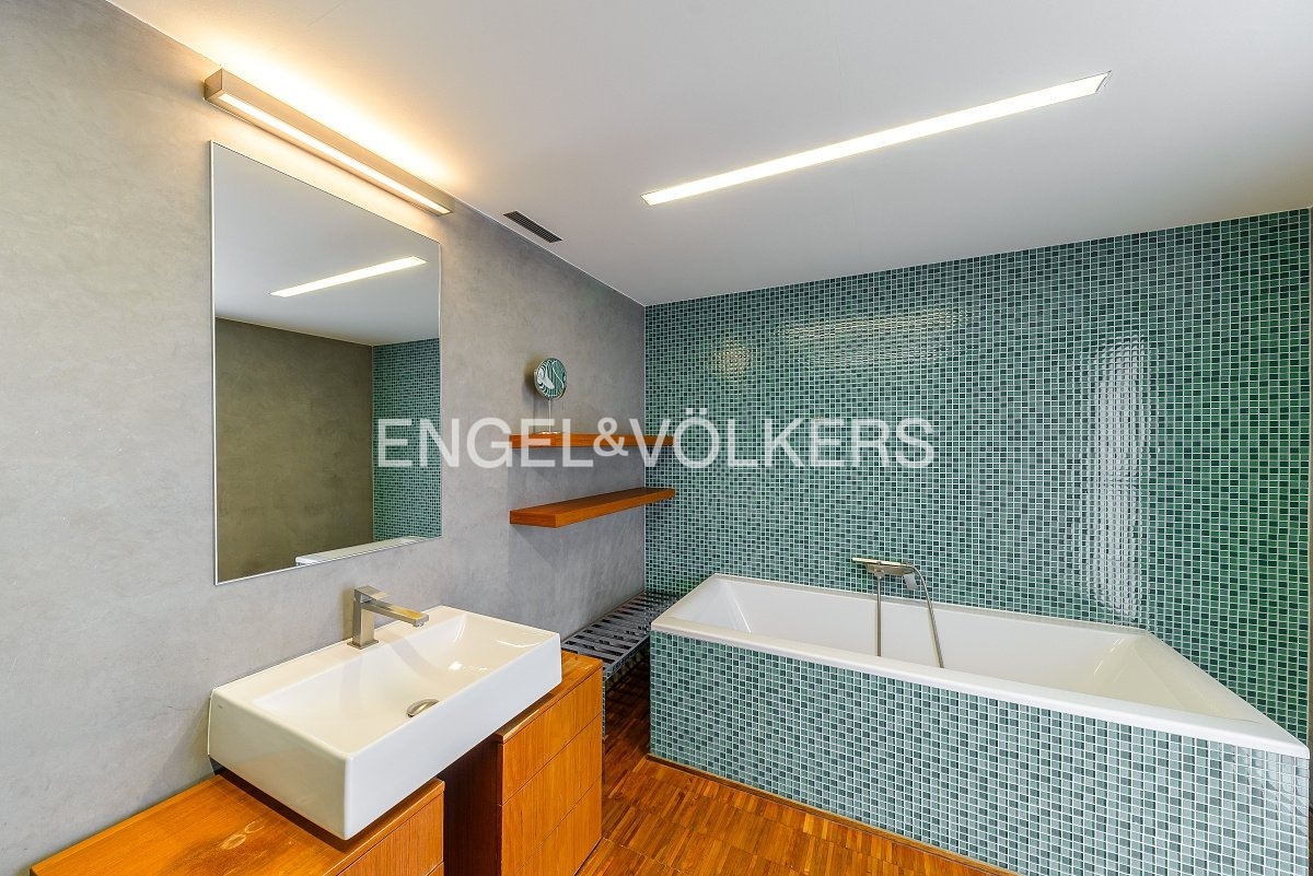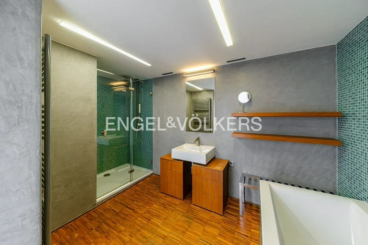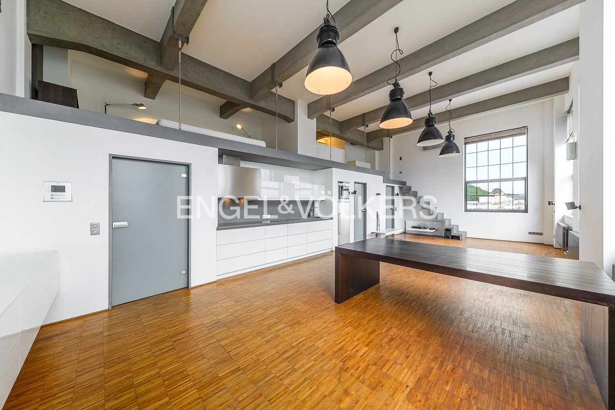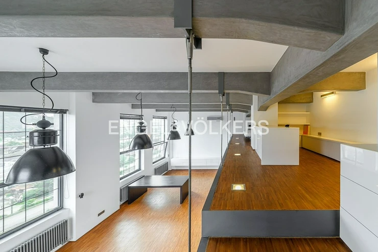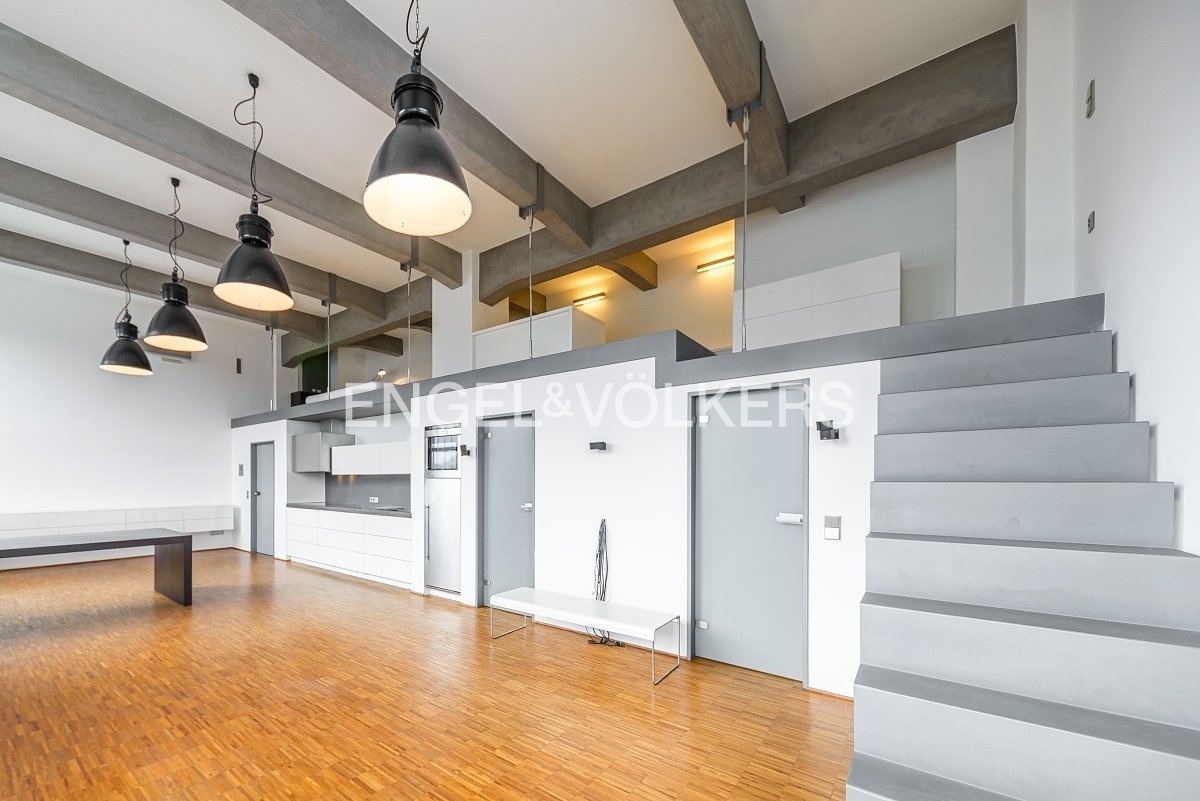 A modern loft apartment with a gallery is part of a well-known SUPERLOFTS project. Situated in an industrial building from the 1900 with a lift, the apartment has unique architecture features. High ceilings and large windows with a beautiful view of Prague. The interior of the apartment is designed as an open space with an entrance right into the living room, kitchenette fully equipped with MIELE appliances, a bathroom with a shower and a separate toilet. An open gallery can be used as a bedroom and a working space with storage options. High-standard equipment consists of a top-notch BOSE HI-FI system, AC, windows that can be opened, blinds and security doors. One parking spot is included in the rent.