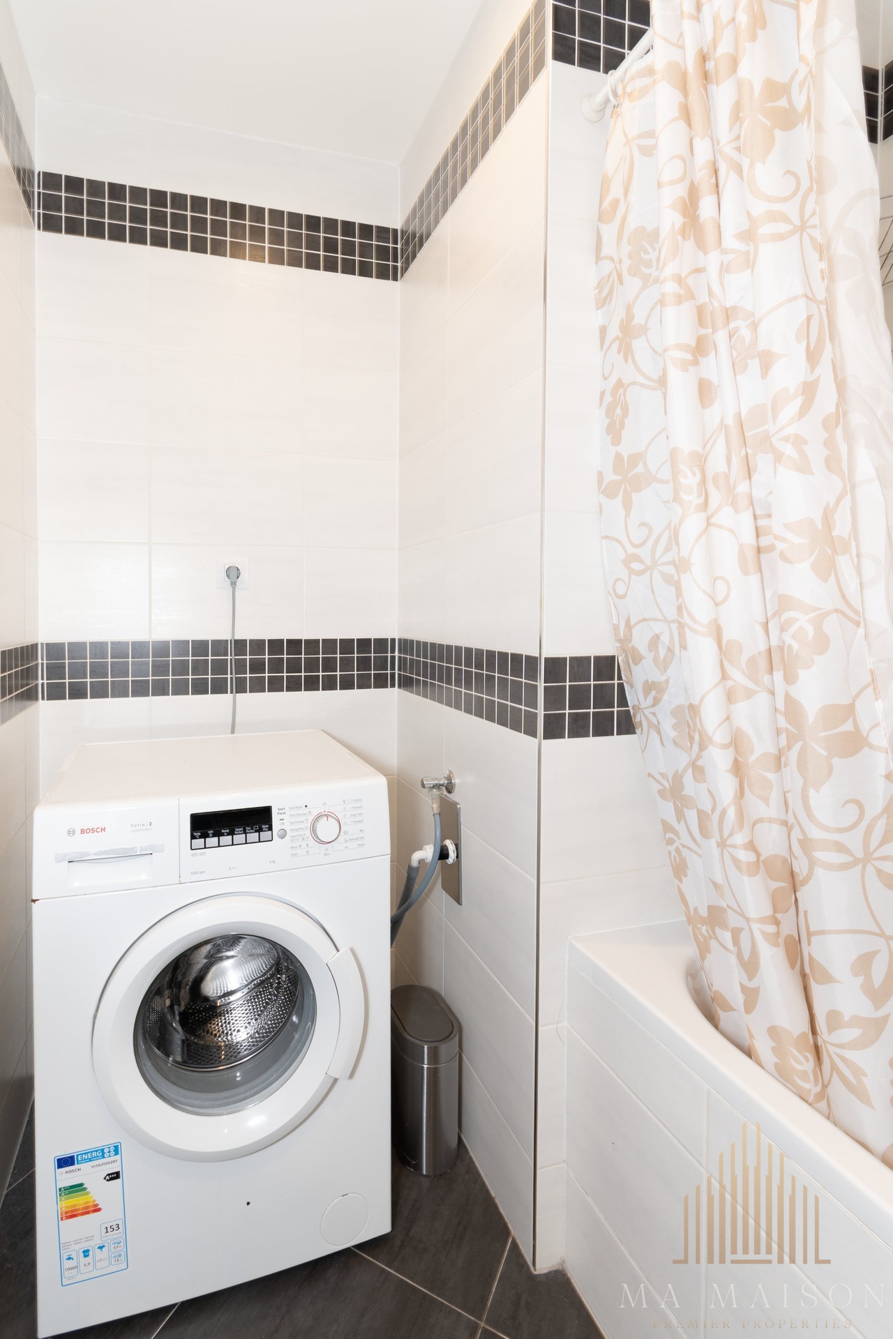 The apartment is fully equipped and ready for immediate move-in. It consists of a living room with a kitchenette and dining area, a separate bedroom, a study (or additional room), a bathroom with a bathtub and washing machine, a separate toilet, and an entrance hallway. The kitchen is equipped with all appliances (oven, hob, extractor hood, fridge with freezer, dishwasher). The living room provides access to the balcony.
