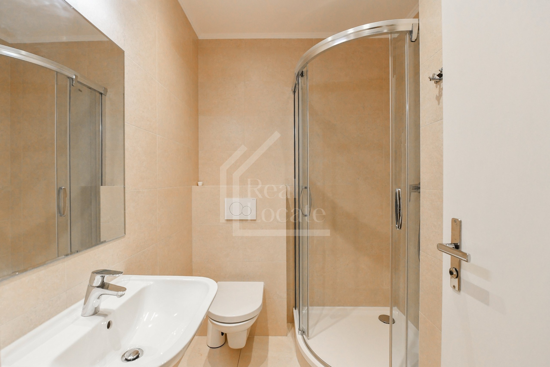The master bedroom is designed as a private suite with direct access to its own balcony, large built-in wardrobes, and an en-suite bathroom with a jacuzzi bathtub, double sink, and toilet. A second bathroom with a shower cabin and WC is also available.