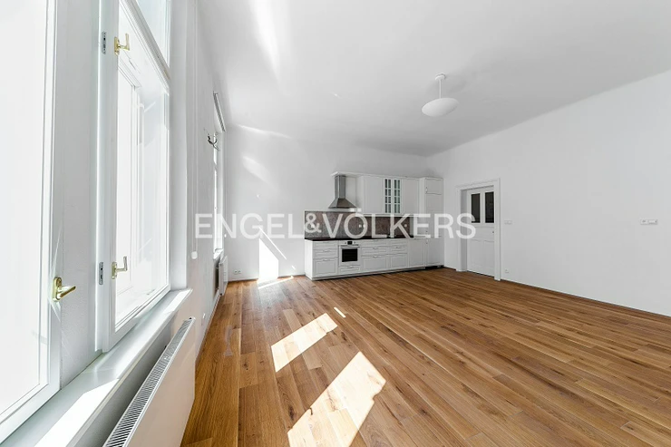 The renovation took care to preserve the period features of the building and the apartment. Only high-quality materials were used in the renovation of the apartments, such as solid oak flooring, high-quality tiles, sanitary ware, replica doors, new casement windows, and designer lighting from Spain.