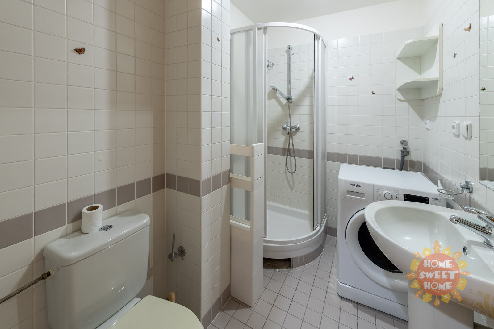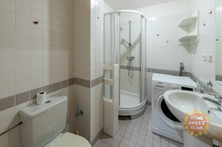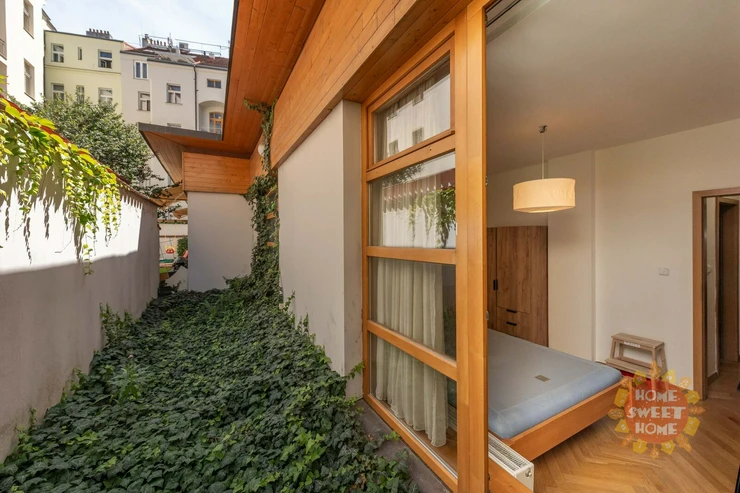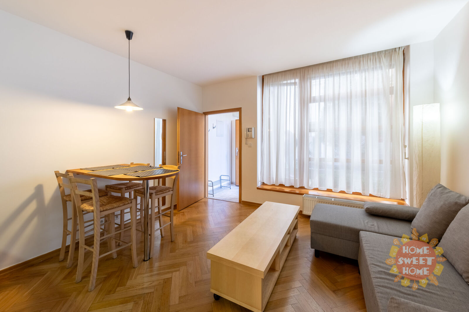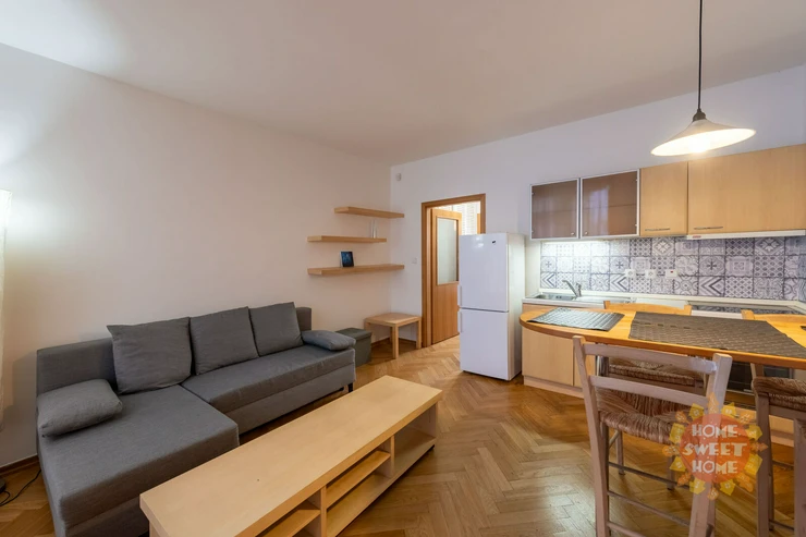 The apartment is fully equipped and offers an entrance hall, a living room with a kitchenette (ceramic hob, electric oven, fridge, dishwasher and a hood), a separate bedroom and a bathroom with a shower, washing machine and toilet. The floors are parquet and tiles. The apartment is oriented to a quiet inner block. There is the possibility of renting a garage space for CZK 6,050.