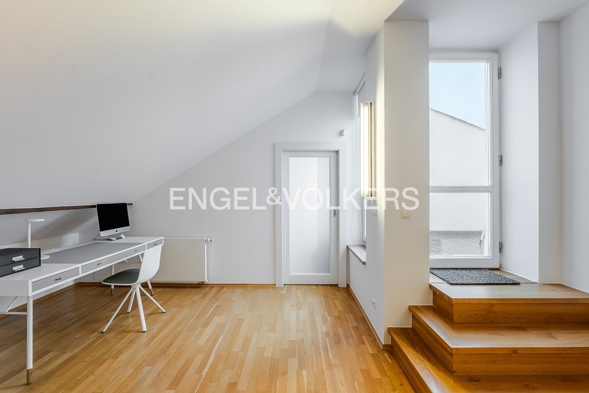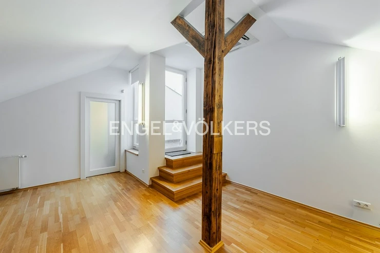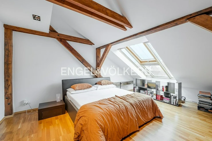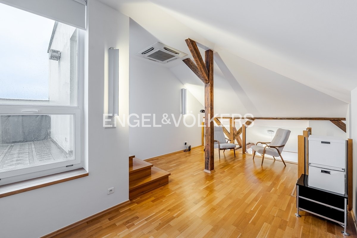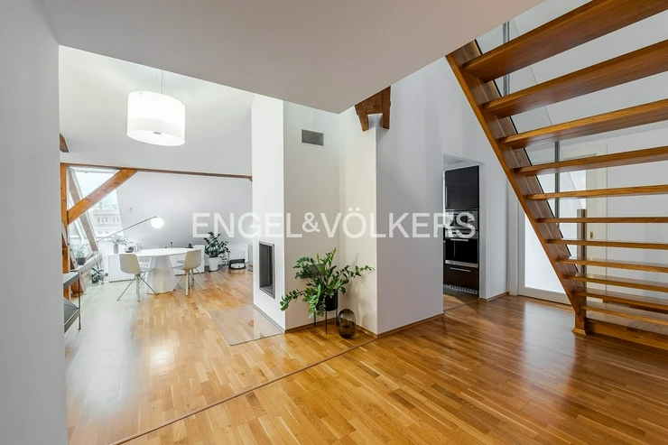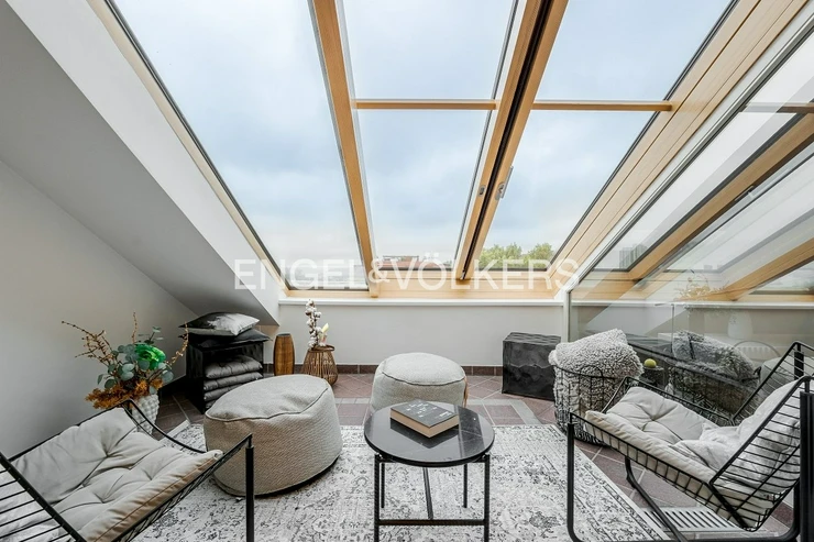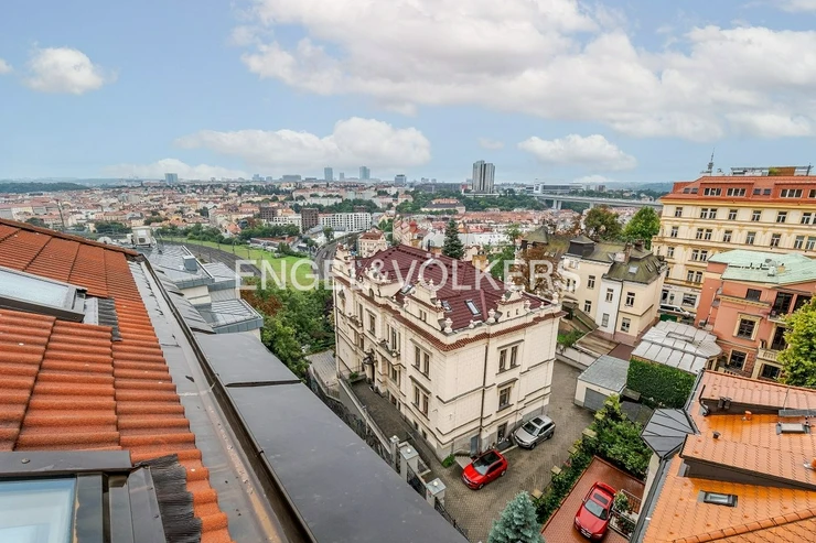 The apartment with a total area of 210 sqm is located on the top floor of a carefully renovated historic building with an elevator on Jana Masaryka Street, in the prestigious Prague Vinohrady district. The apartment includes a terrace (10.5 sqm) and a winter garden (8.5 sqm), which give it a unique character.