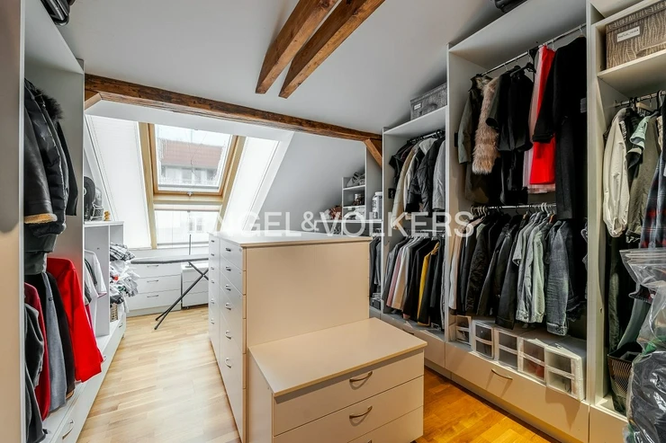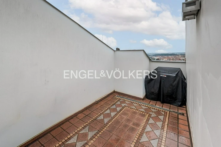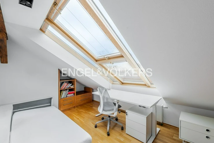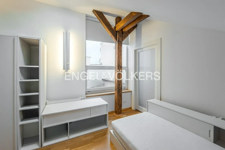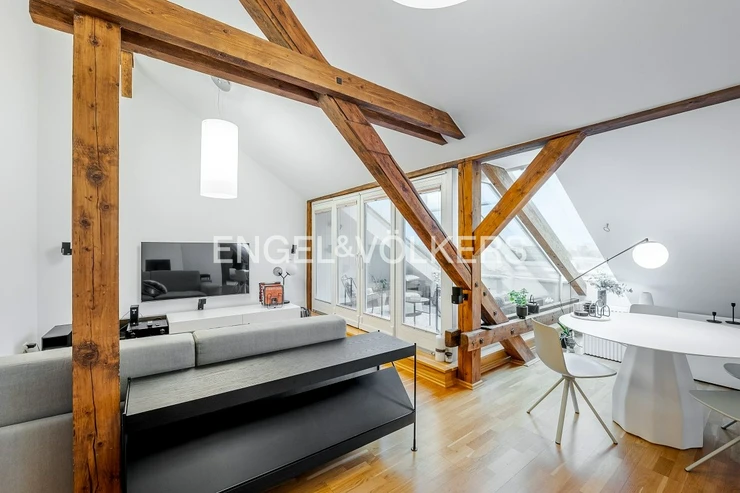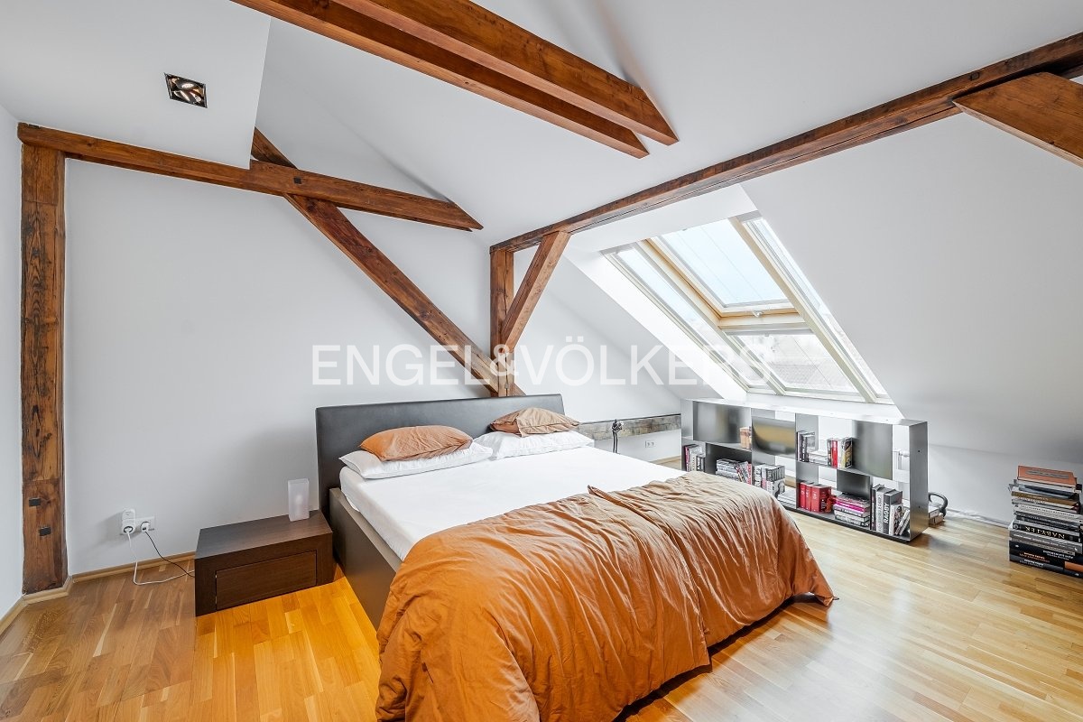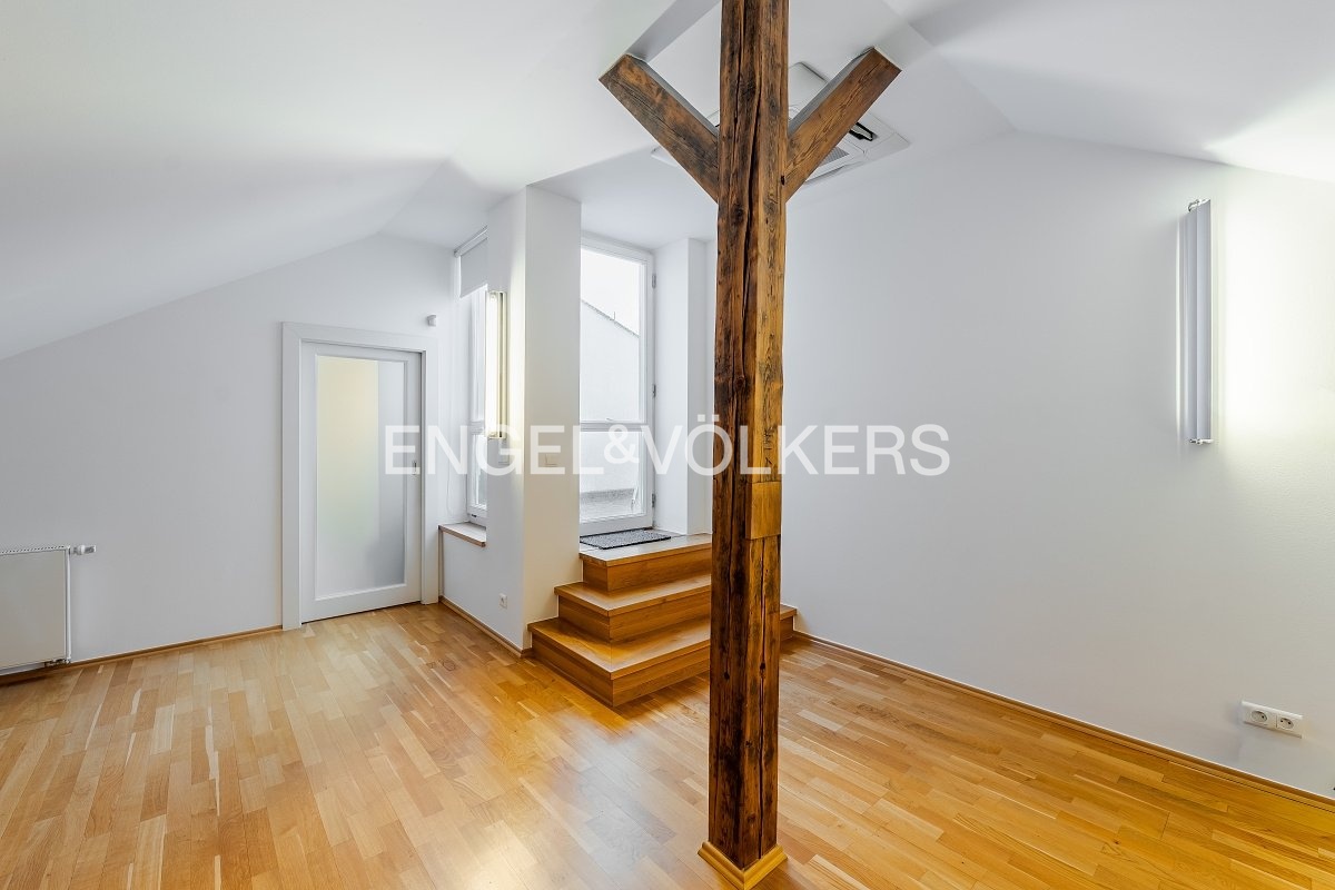The apartment with a total area of 210 sqm is located on the top floor of a carefully renovated historic building with an elevator on Jana Masaryka Street, in the prestigious Prague Vinohrady district. The apartment includes a terrace (10.5 sqm) and a winter garden (8.5 sqm), which give it a unique character.
