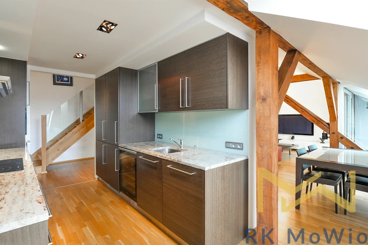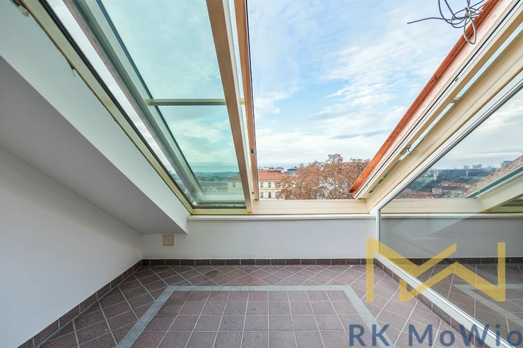 We offer for rent a luxurious furnished (can also be unfurnished upon request) attic duplex 4-bedroom apartment with preserved wooden beams, a floor area of 210 sqm and a 10 sqm terrace, situated on the 4th floor (5th above-ground level) of the sensitively renovated, impressive historic Charlotte Residence with an elevator, on Jana Masaryka Street in the representative residential area of Prague 2 – Vinohrady.