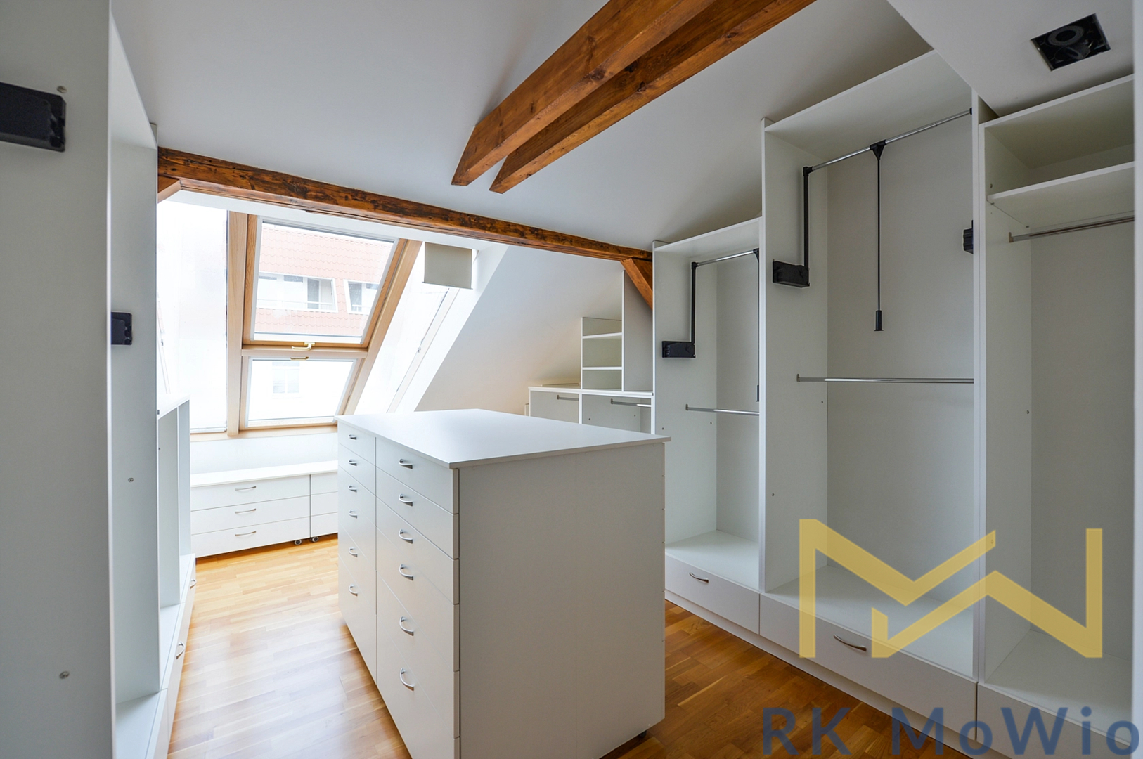 The lower floor layout comprises an entrance hall, an airy living room, a kitchenette with a dining area, a practical pantry and storage room, two bedrooms (one currently used as a walk-in closet), a study, one bathroom (with bathtub, shower, two washbasins, bidet and toilet), a storage room, and a guest toilet. The upper floor offers a gallery, one bedroom with sloped ceilings and roof windows with an en-suite bathroom (shower, washbasin and toilet), and access to the terrace. Additional amenities include a fitted kitchen with a fridge/freezer, ceramic hob, extractor hood, built-in electric and microwave ovens; a wine cooler, built-in wardrobes, washing machine, air conditioning, security entrance doors, a smart home system (mobile-controlled), underfloor heating in the bathrooms and the toilet, wooden floors and tiles. The apartment includes two cellar storage units and one parking space included in the rent, with an additional parking space available for an extra fee in a car stacker.