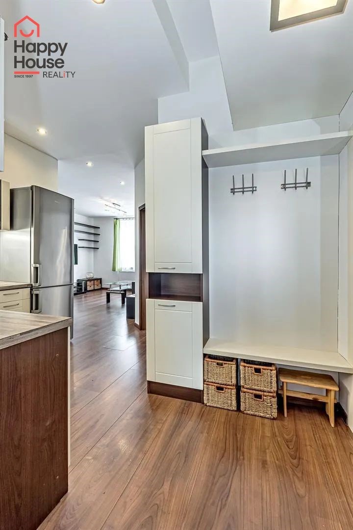 Bright, spacious one-bedroom apartment on the 5th floor of a brick building with an elevator in Prague 4 - Nusle. The apartment is fully furnished and offers a spacious hallway with a kitchenette, a living room, a bedroom, and a bathroom. The kitchenette is equipped with a ceramic hob, electric oven, fridge with freezer, and an extractor hood. The bathroom has a bathtub, toilet, washing machine and and electric boiler. Street parking - zones.