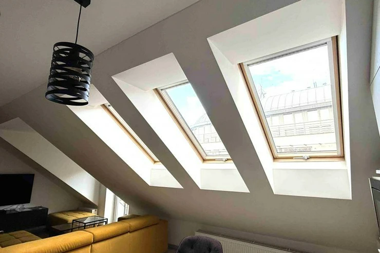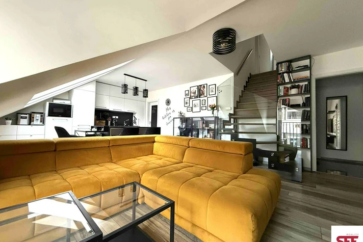 We offer for long-term rent a stunning and architecturally distinctive duplex apartment (2+kk with a study) with a total area of 72 sqm, located on the 3rd floor of a building with an elevator in Novákových Street, Prague 8 Palmovka.