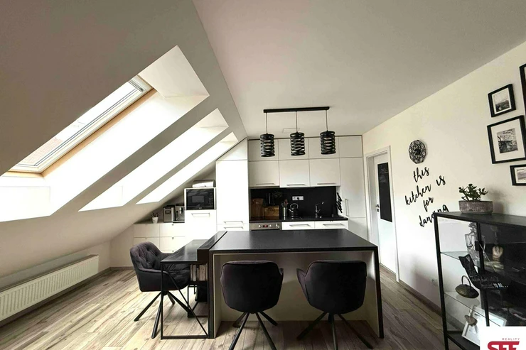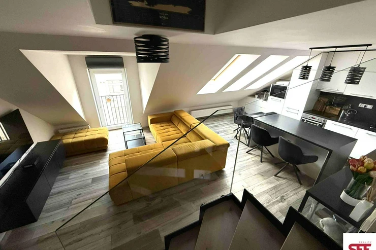The apartment is fully furnished with high-quality furniture and appliances and has been designed with an emphasis on openness, functionality, and modern design. The dominant feature of the interior is a designer glass staircase, which gives the apartment a unique character. The layout offers a spacious and bright living room with a modern, fully equipped kitchen, complemented by a practical pantry for food storage. There is also a separate bedroom, an open space suitable as a study, a bathroom, and an entrance hallway.