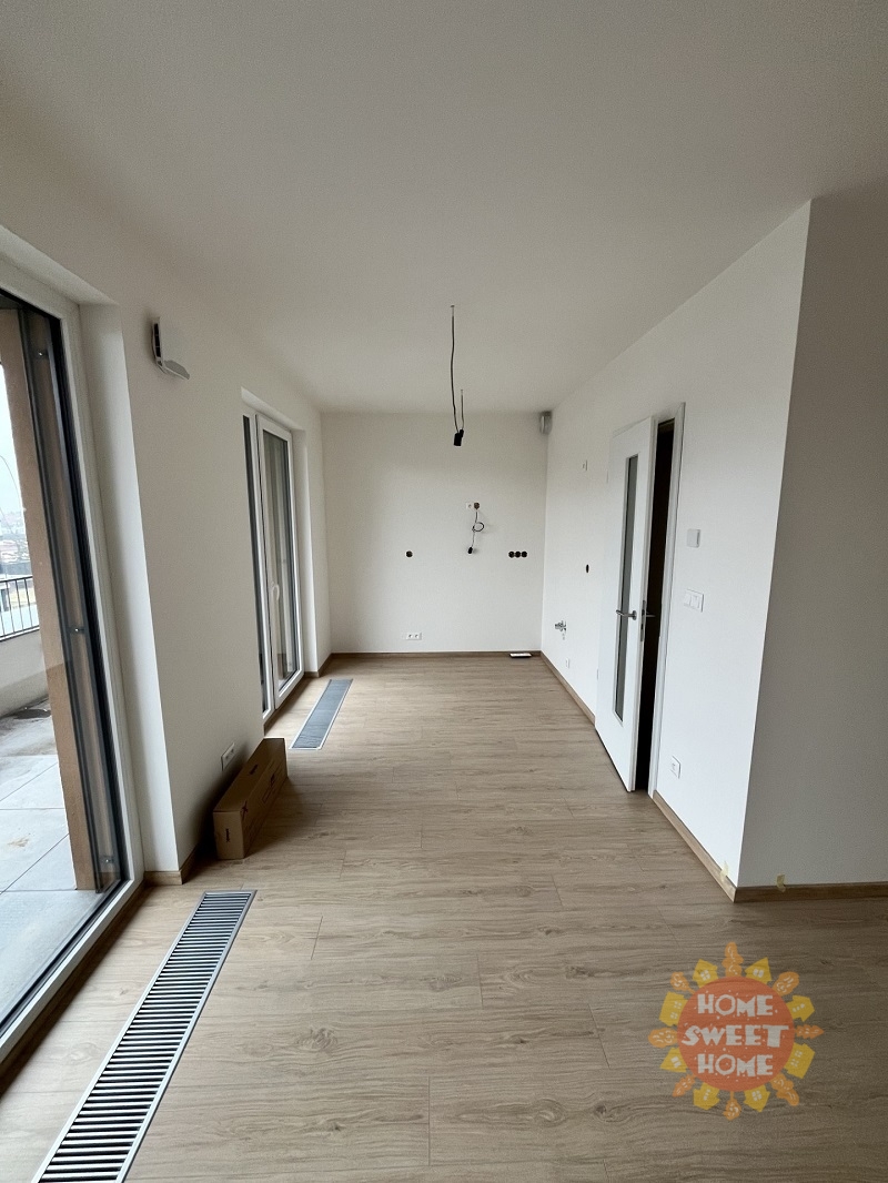 The layout of the apartment consists of an entrance hall with built-in wardrobes, a living area with a kitchenette, a separate bedroom with a built-in wardrobe, and a bathroom with a shower and toilet. The kitchen will be equipped with built-in appliances, including a dishwasher and washing machine. The living area has direct access to the terrace with outdoor blinds and a pleasant view of the surroundings. The apartment is partially furnished, allowing future tenants to customize the interior to their liking. Comfortable living is ensured by a central ventilation system with heat recovery and, in the summer months, air conditioning for cooling the space. The apartment also includes a 3 m² cellar. Free parking is available directly in front of the building.