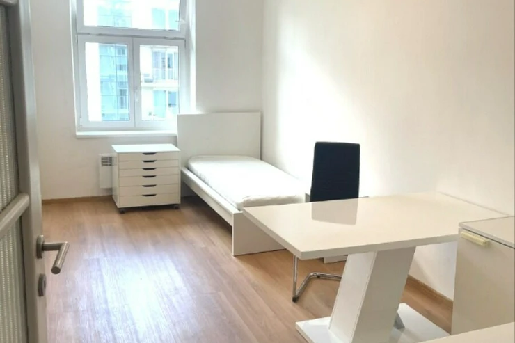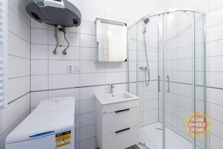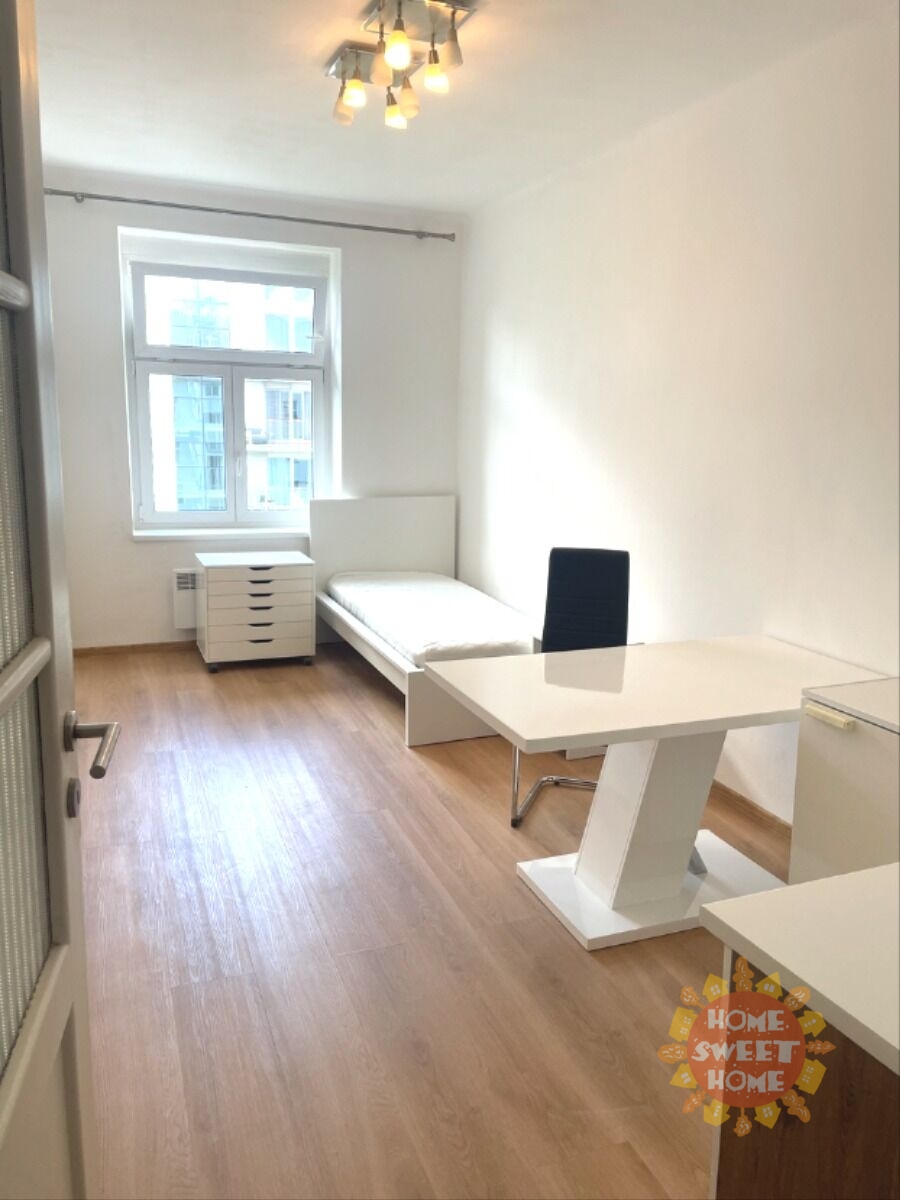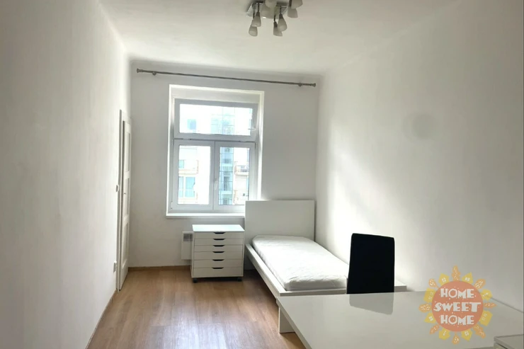 We offer for rent a partly furnished apartment 1+kk with a total area of 22m2, located on the 5th floor of a brick building with elevator in Hradešínská street, Prague 10 - Vinohrady. The apartment consists of an entrance hall, one room with kitchenette, dressing room and bathroom with shower, washing machine. Toilet is separate. The apartment has been partially renovated, including the bathroom. There is a simple kitchenette, a refrigerator, a bed, and a dining table in the room. The apartment is north-facing with a view of the gardens of the Korunní dvůr residential complex.