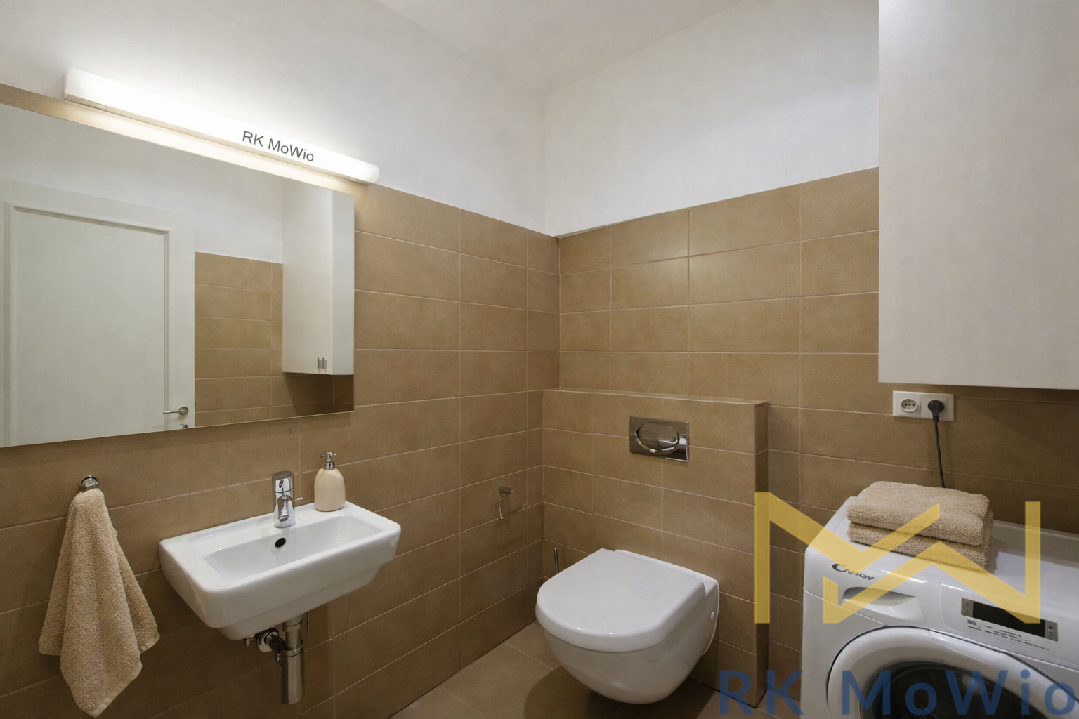 The apartment layout consists of an entrance hall, a spacious living room with a kitchenette and dining area, a bedroom, a bathroom (with bathtub and washbasin), and a separate toilet. Additional equipment includes a Schuller kitchen unit with refrigerator and freezer, ceramic hob, extractor hood, electric and microwave ovens, waste disposer, dishwasher; built-in wardrobes, washing machine and dryer, Villeroy & Boch sanitary fittings in the bathroom, security entrance door, video intercom, high-speed internet (UPC, Telefonica, O2), solid oak floors, and Spanish tiles.
