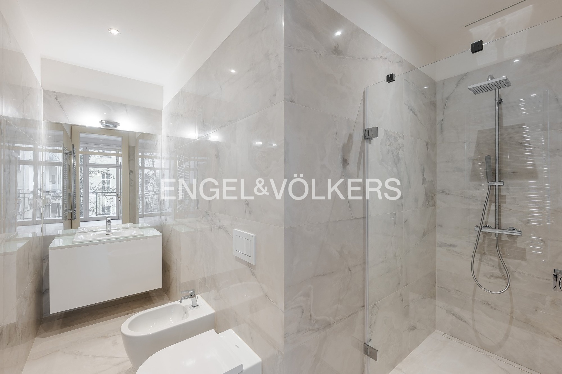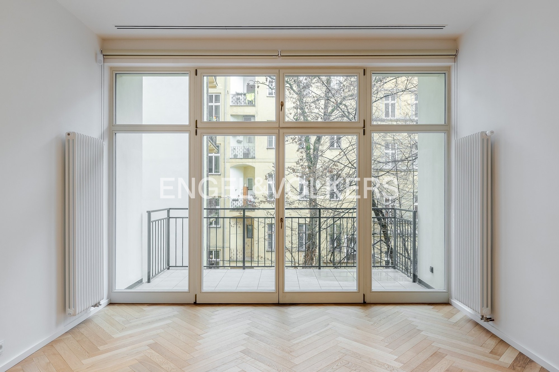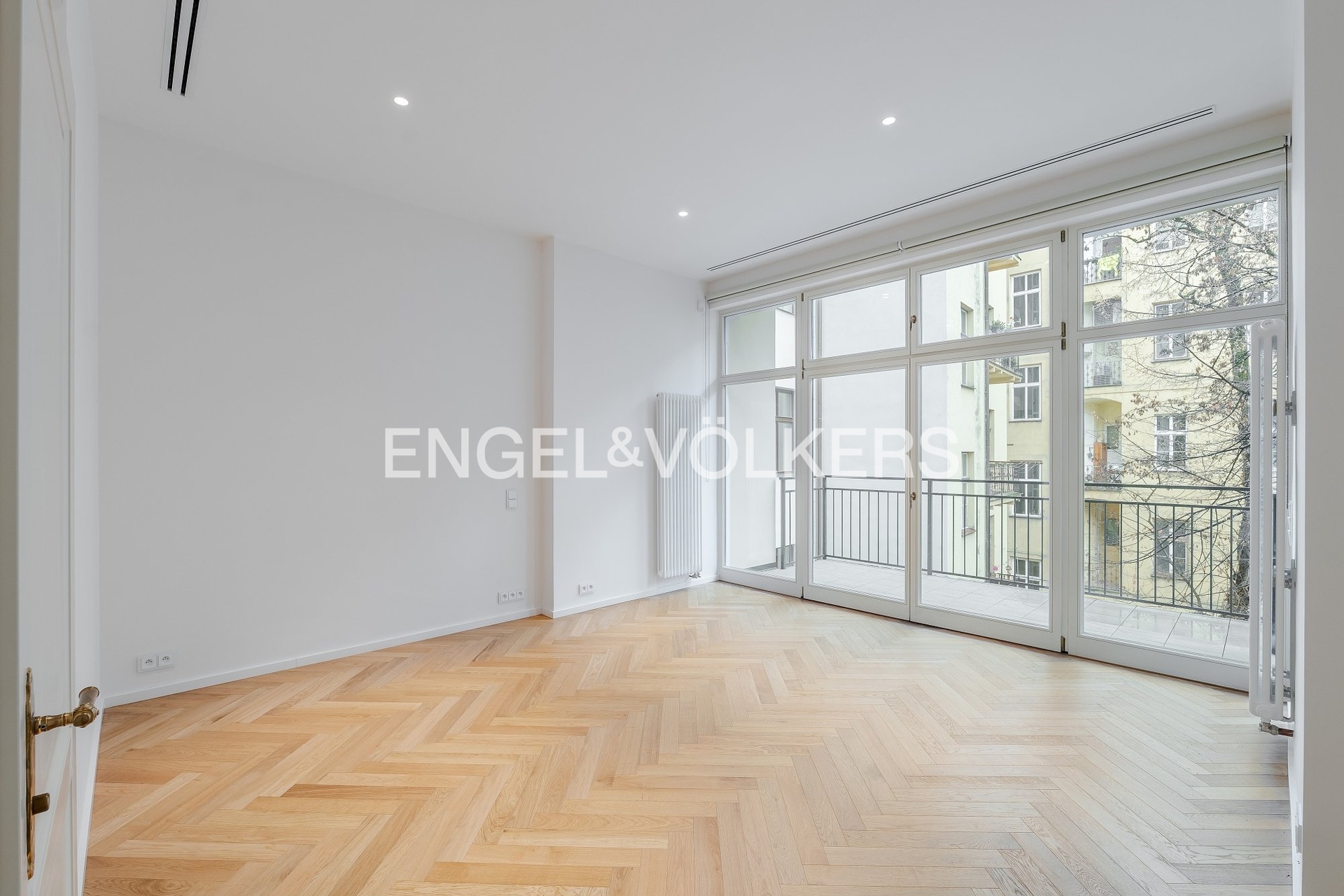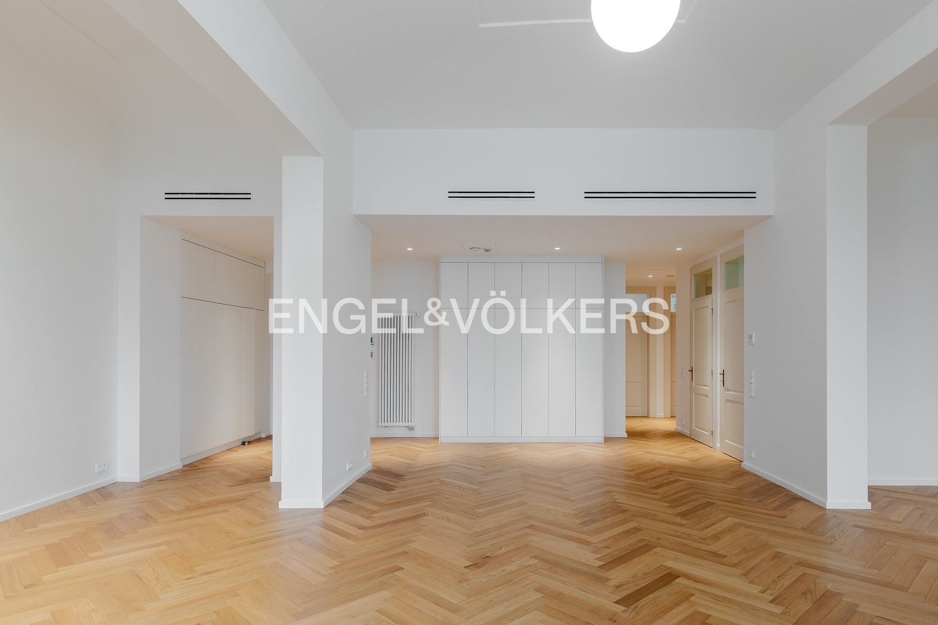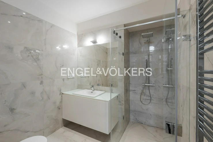 The apartment offers high-end equipment and quality materials – air conditioning, oak parquets, large-format tiles, high vaulted ceilings, security entrance doors, blinds, video intercom, washing machine, dryer, dishwasher, induction hob, and microwave. A cellar unit belongs to the apartment. An electric vehicle charger is also available in the building.