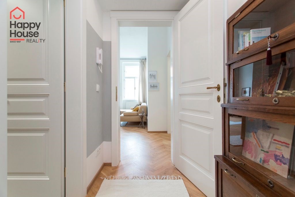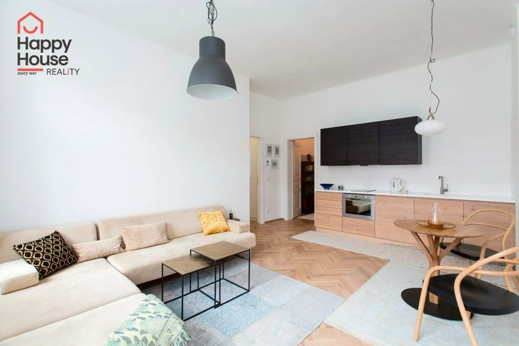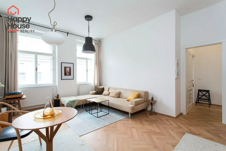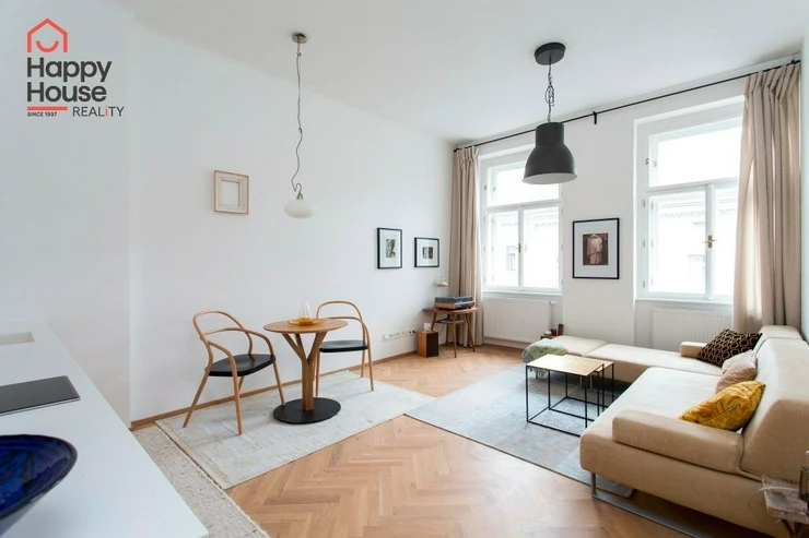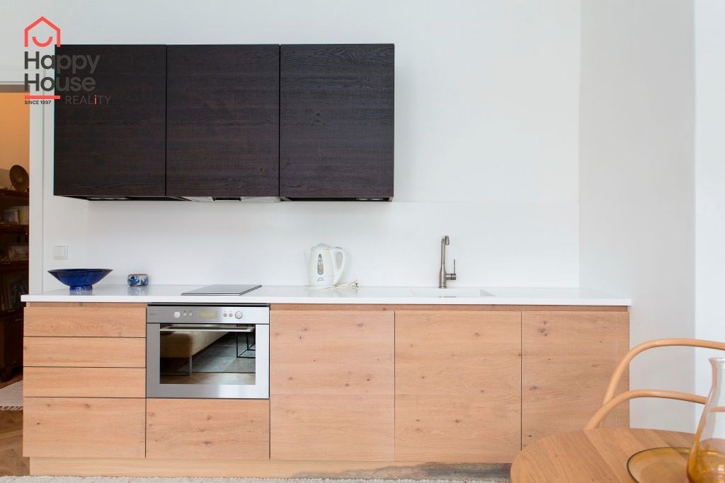 We offer a beautiful, bright, stylishly furnished one-bedroom apartment for medium-term rent, located on the 3rd floor of a brick building with an elevator in the sought-after area of Prague 7 in Bubeneč. The modern kitchenette includes a refrigerator, a glass-ceramic double stove, and a combination of electric and microwave ovens. The bathroom has a bathtub, with a separate toilet. The apartment also includes a washing machine. Internet from Vodafone and O2 is available in the building. The floors are oak parquet and tiles. There is a gas boiler in the apartment. Street parking - zones.