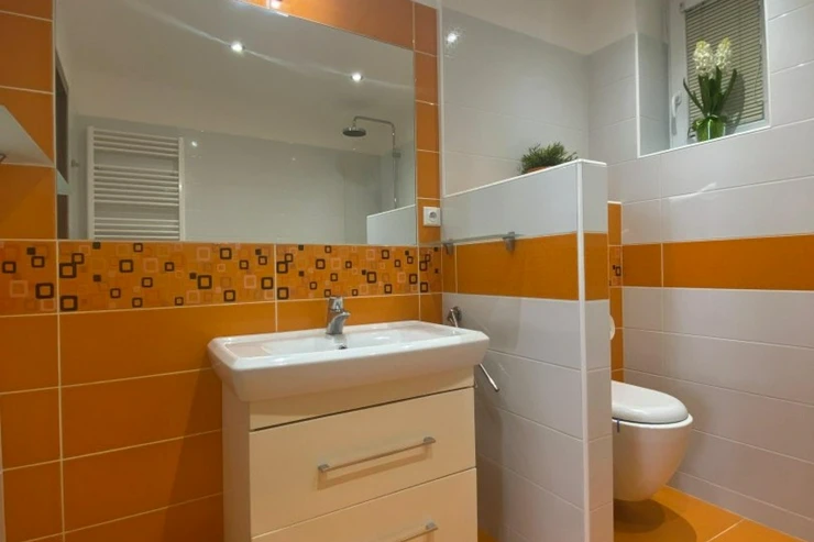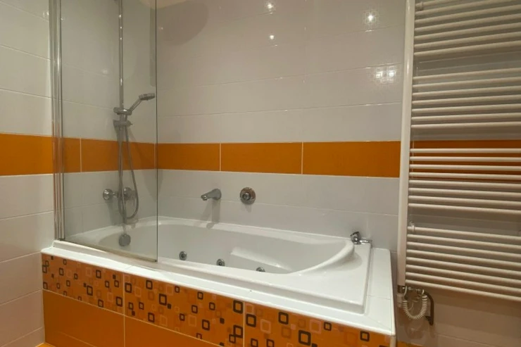 Koupelna disponuje vanou a toaletou, samozřejmostí je podlahové vytápění pro vyšší komfort.