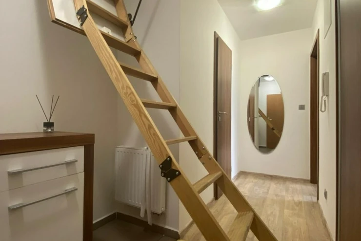 Velkou výhodou bytu je praktický úložný prostor v chodbě řešený výsuvnými půdními schody. Tento prostor je ideální pro sezónní věci, kufry či další vybavení domácnosti.