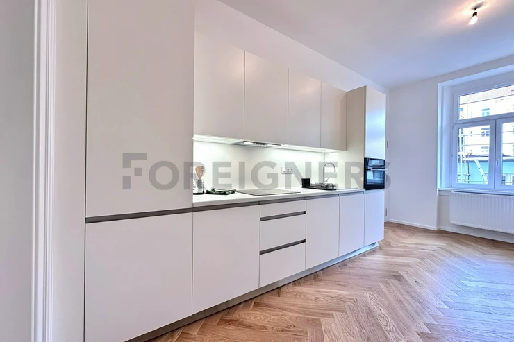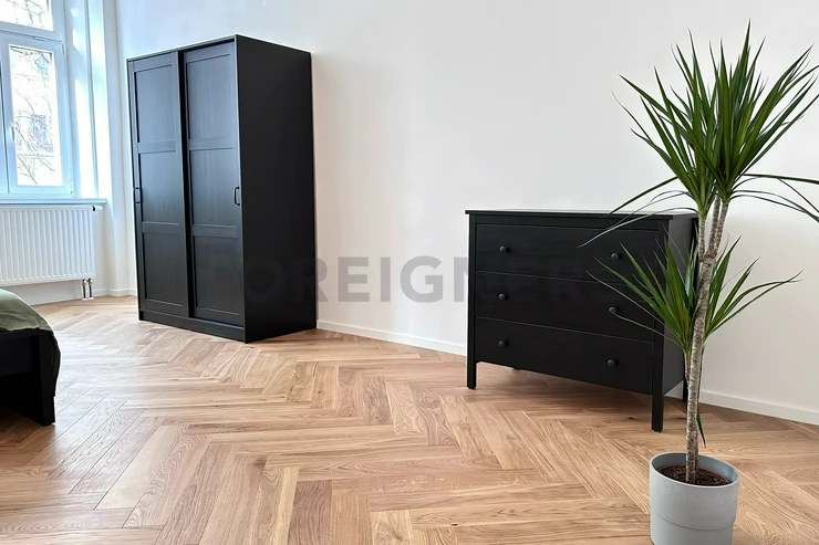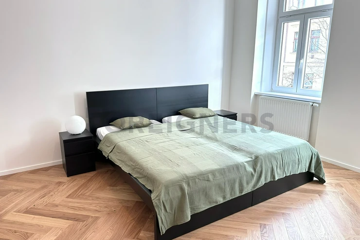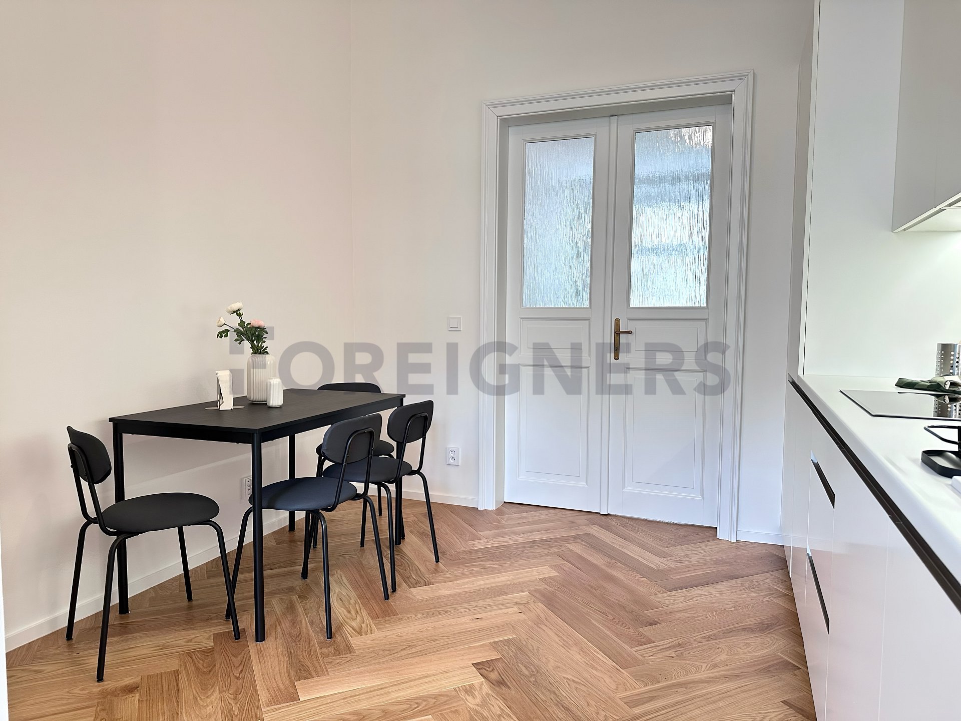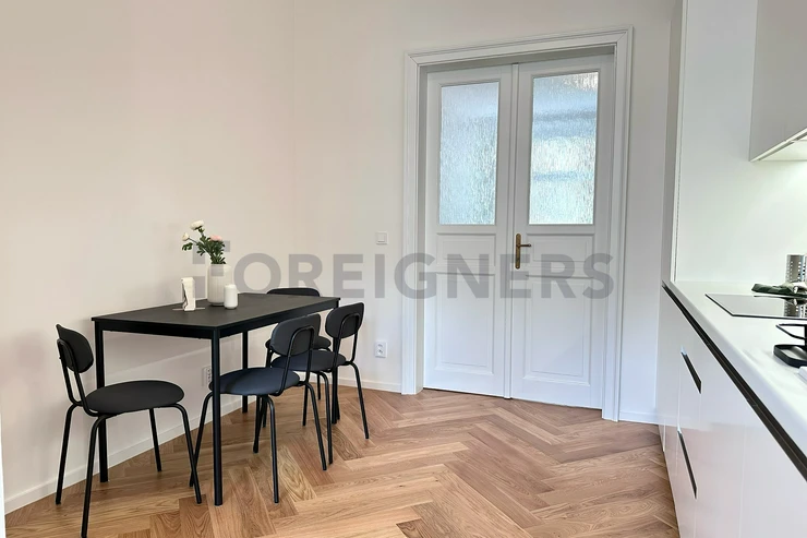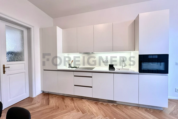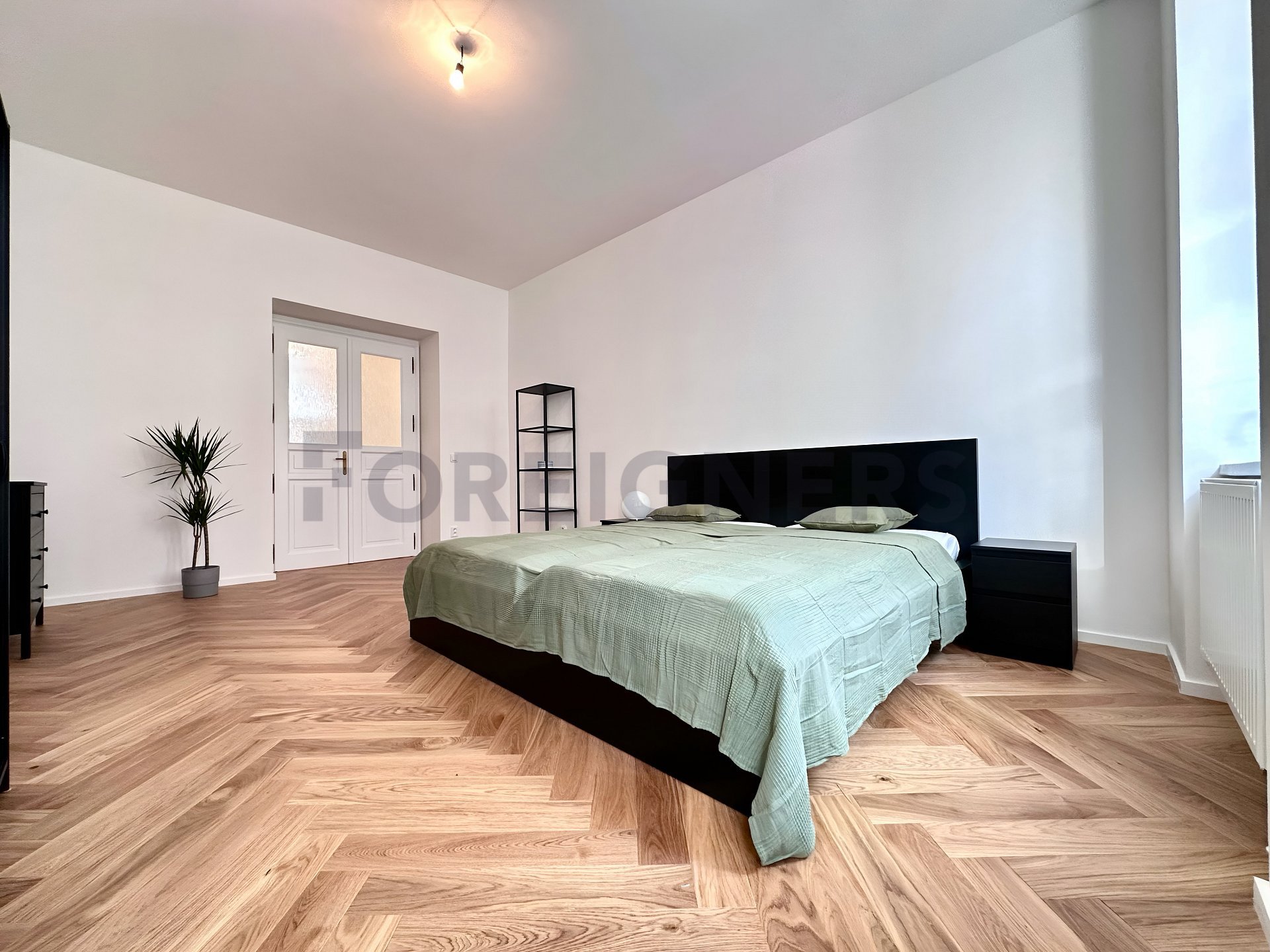 We offer for rent a brand-new, fully renovated bright 1-bedroom apartment (2+kk) with a total area of 45 m², located on the 1st floor of a building without an elevator in the quiet Velehradská Street. The apartment has undergone a thorough renovation and provides modern, tasteful and very comfortable living.
