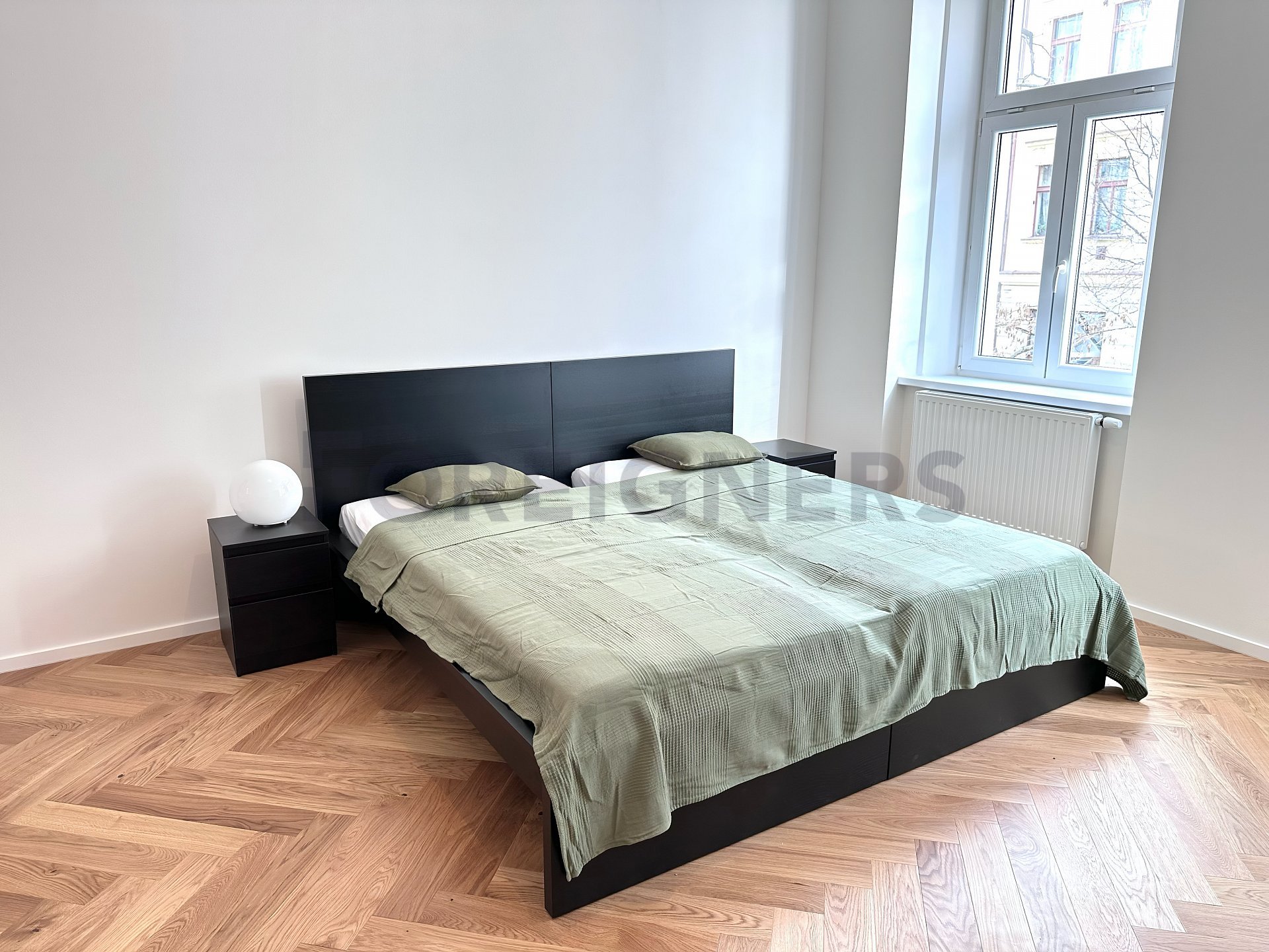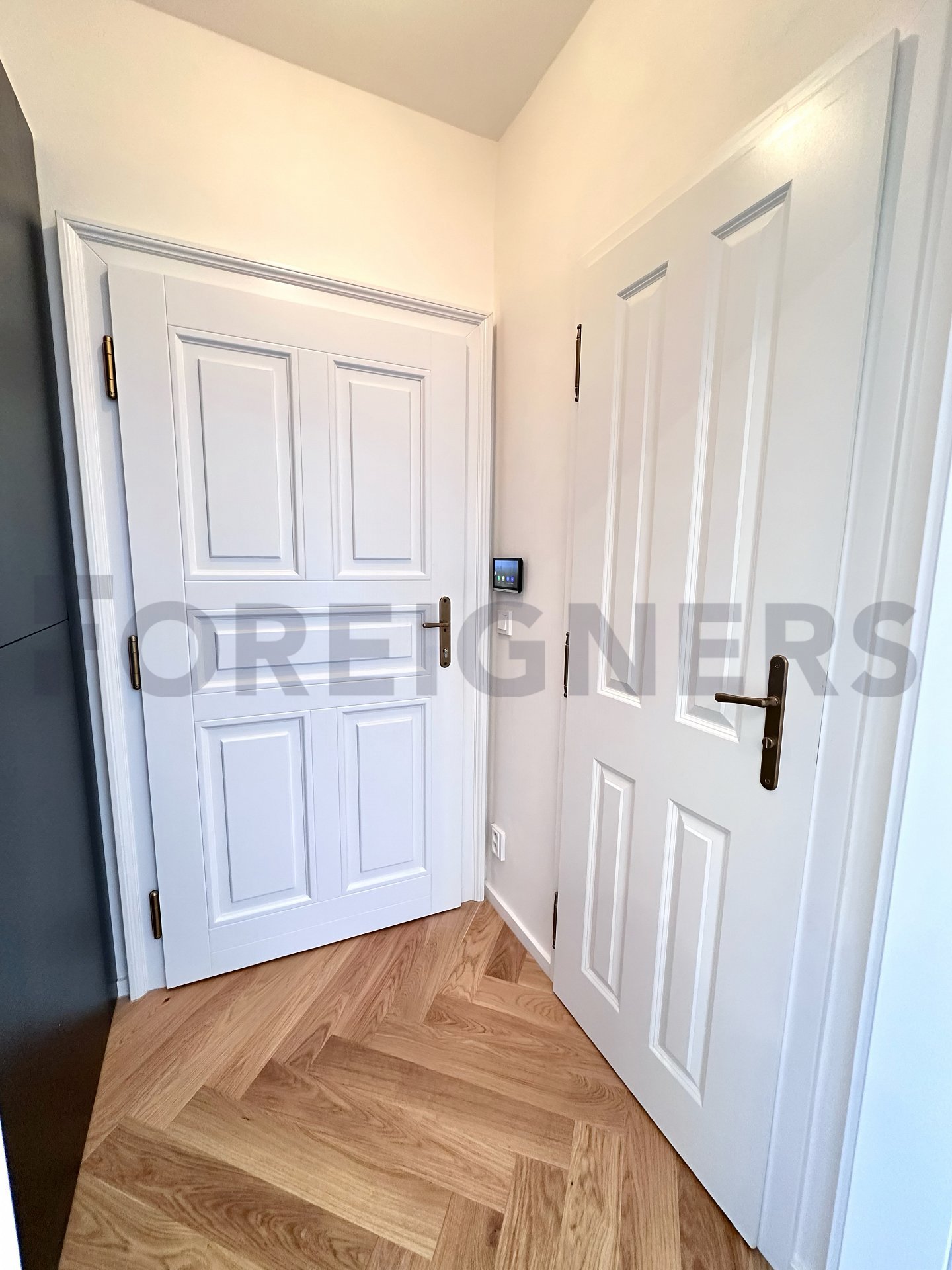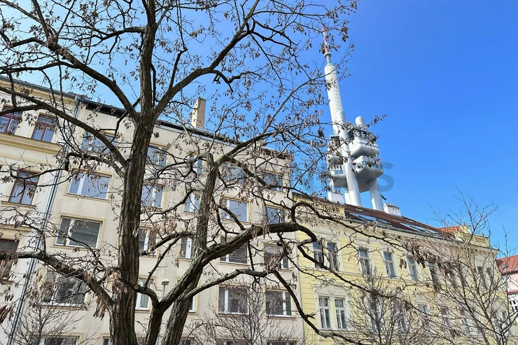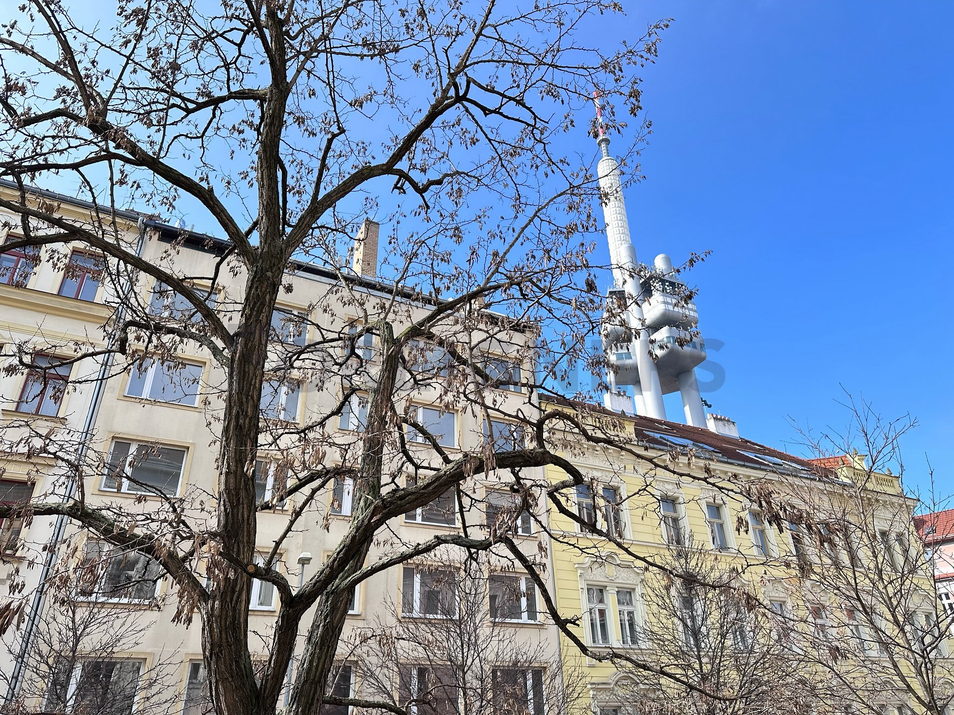The interior features high-quality wooden floors and a newly designed Hanák kitchen that harmoniously complements the overall style of the apartment. The apartment will be fully furnished, offering immediate and comfortable move-in without the need for any additional investment. The bedroom also enjoys a direct view of the Žižkov Television Tower.