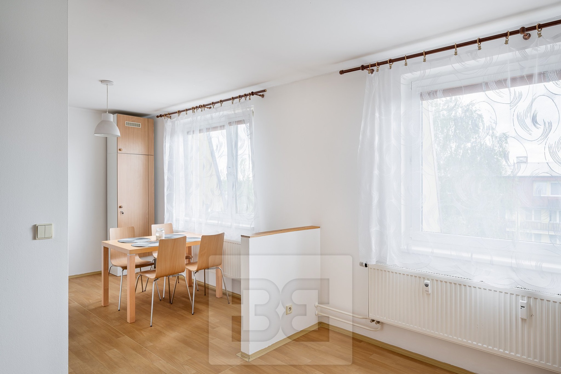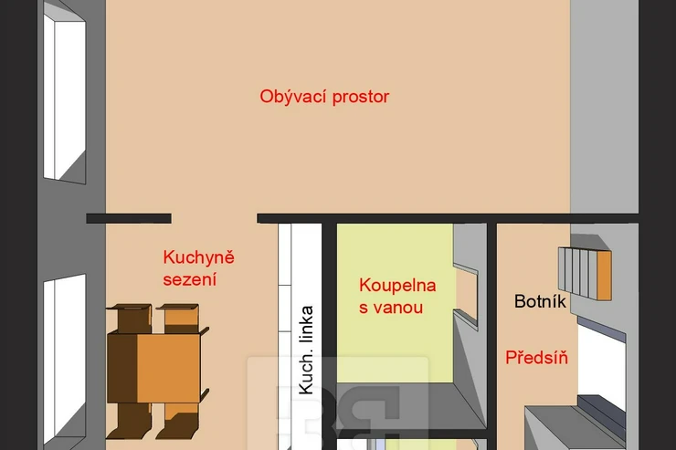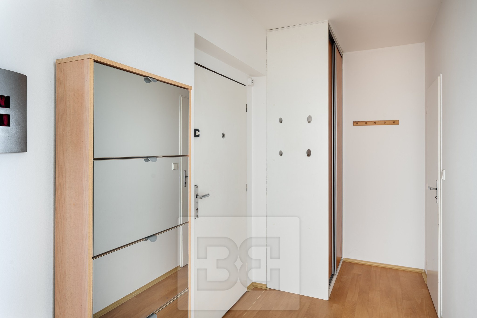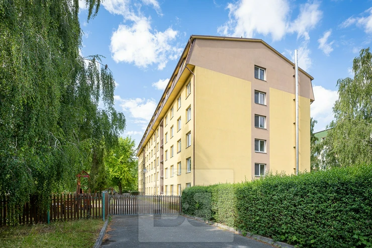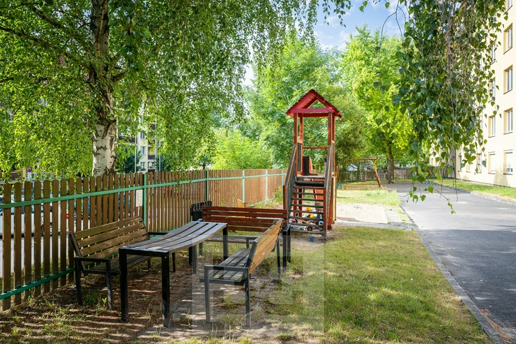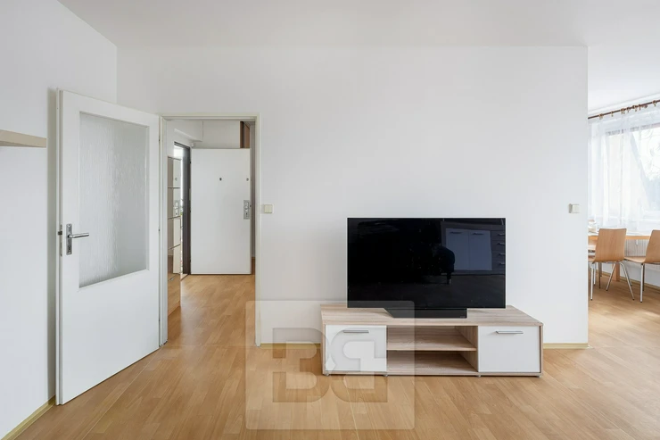 The apartment is available for immediate move-in. It is a brick-built extension clad with plasterboard (SDK) on top of a panel building with an elevator. The apartment is partially furnished (kitchen unit, fridge with freezer, microwave, dining table and four chairs, built-in wardrobe and shoe cabinet in the hallway).