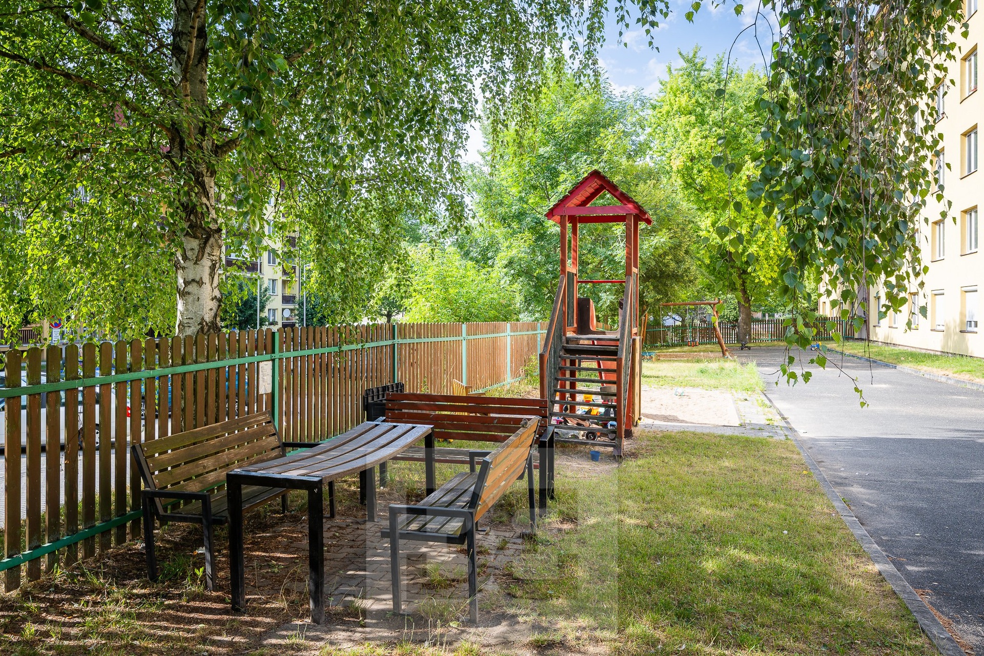 The apartment has been freshly painted, features mainly vinyl flooring, and does not include a cellar/storage unit. Parking is available in the parking lot next to the building. In front of the house there is a private fenced playground and a fire pit.