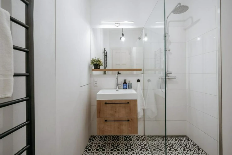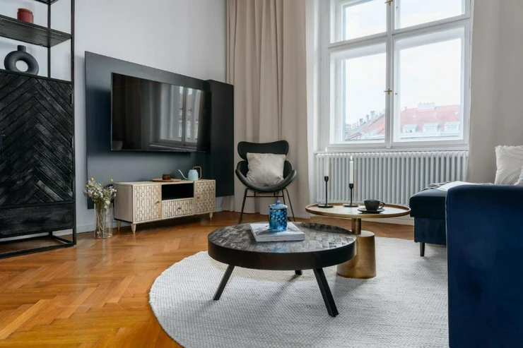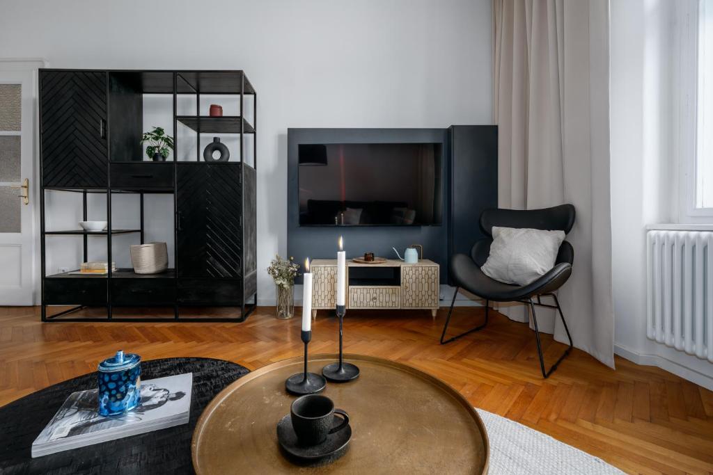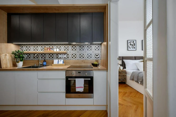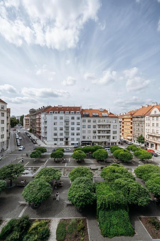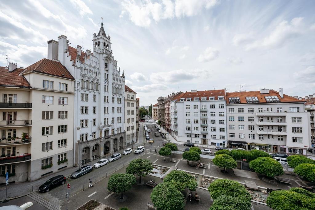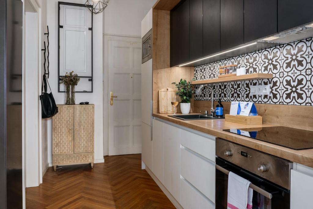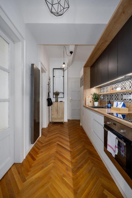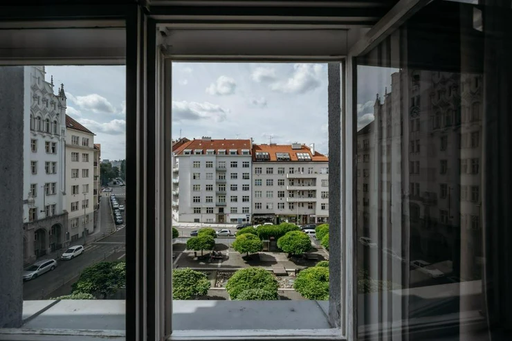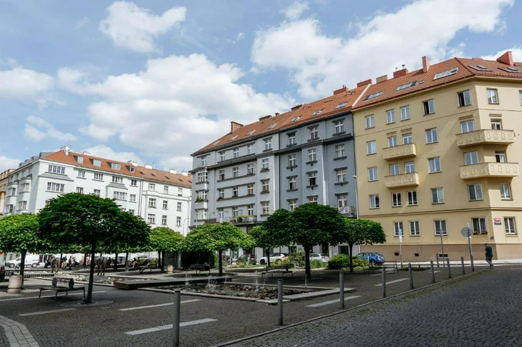 The kitchen is in the hallway. The apartment has its own heating and a view of Šabach Park.