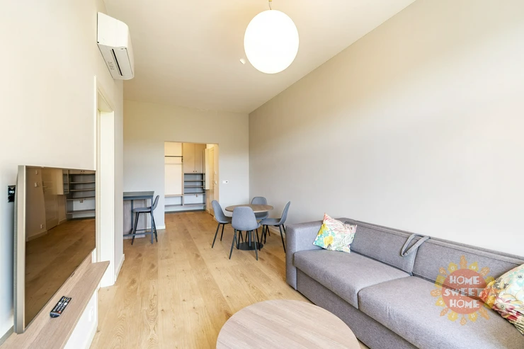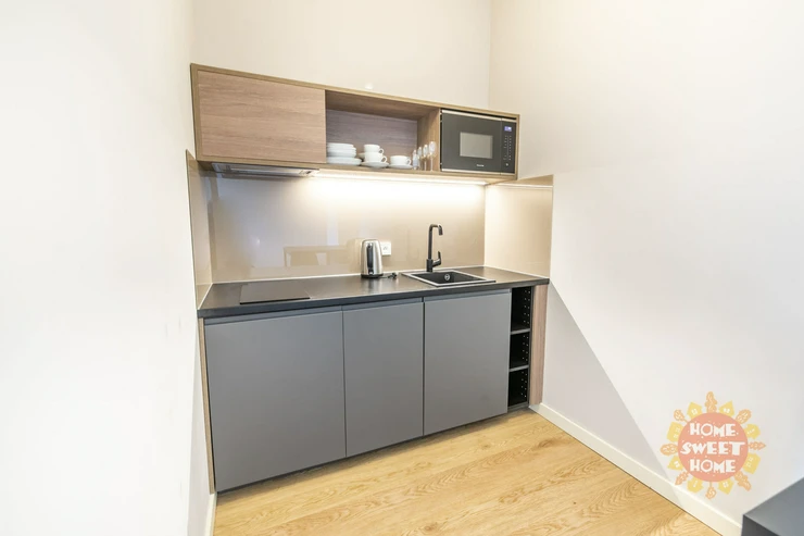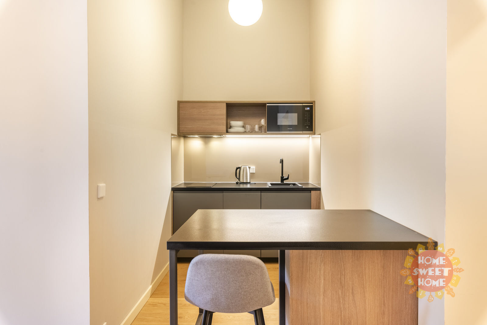 The apartment consists of a living room with a fully equipped kitchen, a bedroom and a bathroom with a shower and a toilet. There is a washing machine. The house has a 24/7 reception and a laundry room. The price includes energy, high-speed Wi-Fi, 68 TV channels, garbage collection, cleaning of common areas, reception. Possibility of cleaning and change of bed linen for a fee.