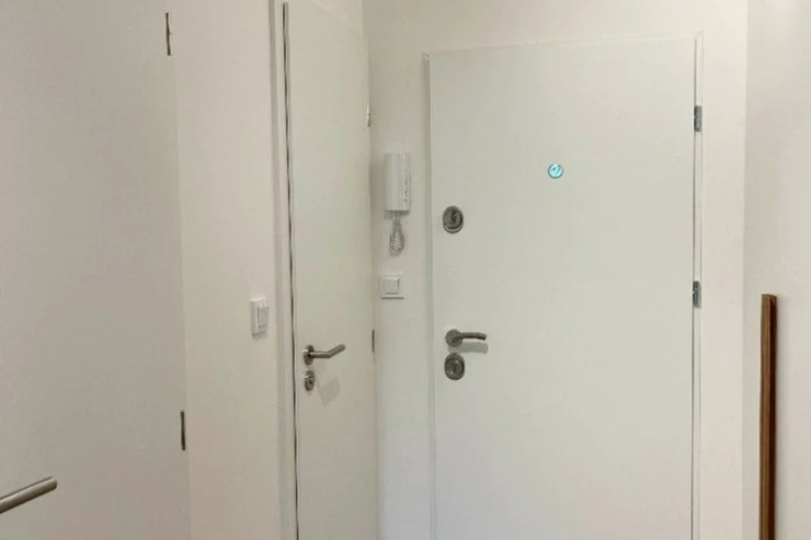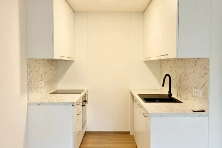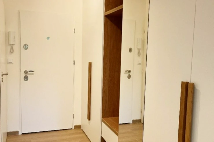 Byt nabízí obývací pokoj s kuchyňským koutem, samostatnou ložnici, koupelnu se sprchovým koutem, samostatné WC, předsíň s vestavěnými skříněmi a komoru na chodbě přímo před bytem. Kuchyňská linka je vybavena varnou deskou, troubou, digestoří, pračkou a lednicí s mrazákem.