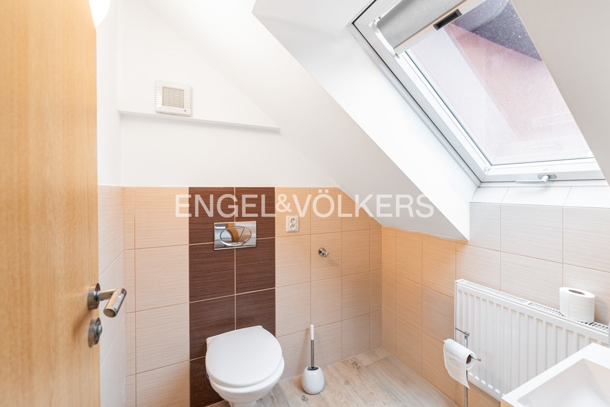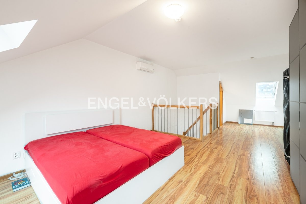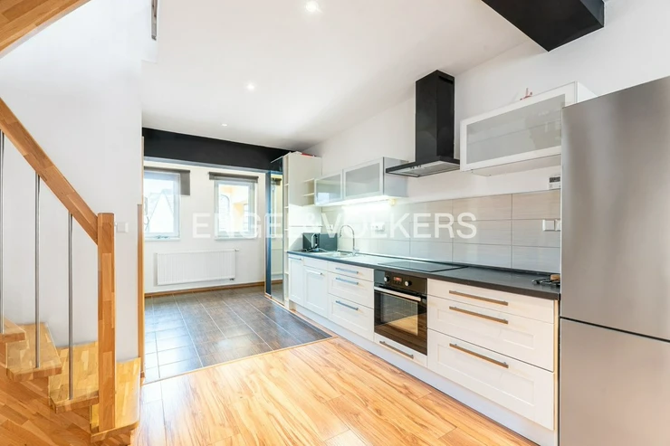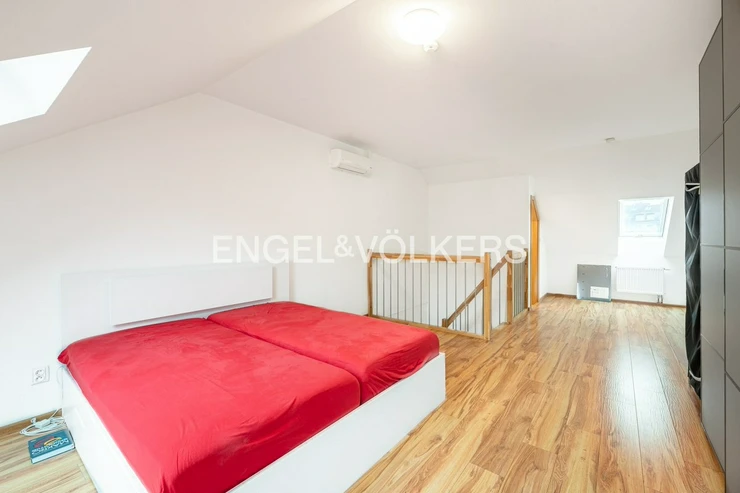 The lower level consists of a living room with a fully equipped kitchen, a bathroom with a bathtub and a shower screen, and a separate toilet. The upper floor has a bedroom and a second toilet, which significantly increases the comfort of living. The apartment includes a shared loggia of approximately 3 m². The apartment is rented furnished and is also equipped with air conditioning on the upper floor.