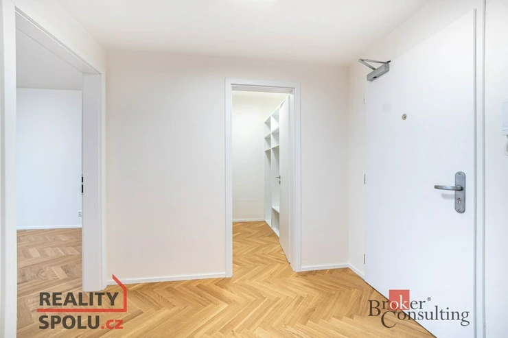 Velkým benefitem je samostatná šatna s vestavěnými skříněmi, díky které nemusíte řešit další objemný nábytek.