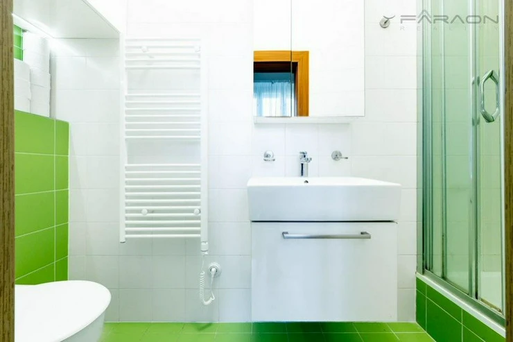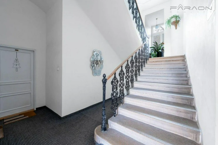 The apartment is fully furnished with custom-made furniture and equipped with all modern appliances - refrigerator, multi-function oven, induction hob, dishwasher and washer/dryer. Practical storage spaces ensure maximum use of space. Heating is provided by Sencor electric heaters and new casement windows provide optimal tightness, excellent insulation and at the same time preserve the elegant historical appearance of the apartment.