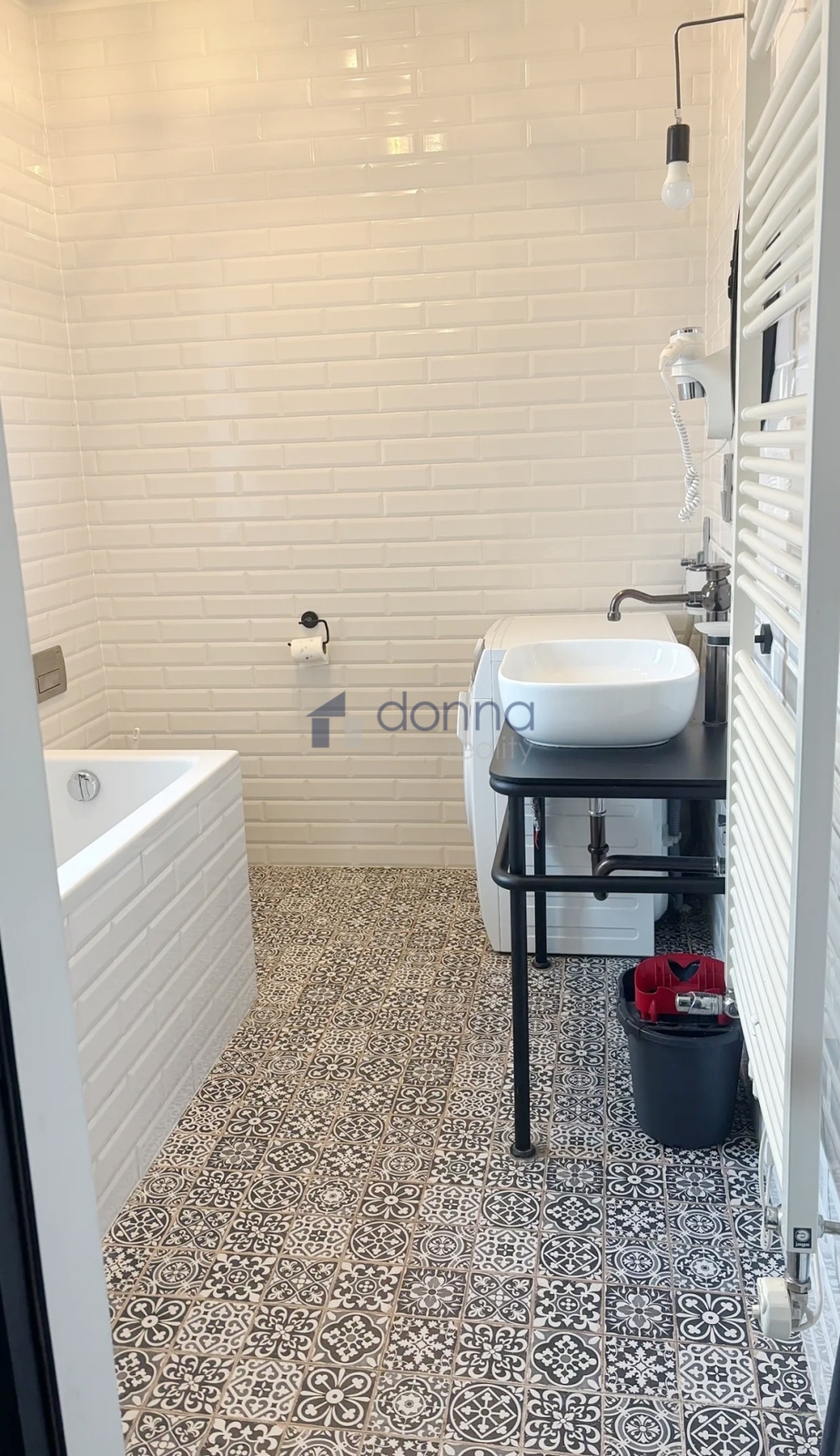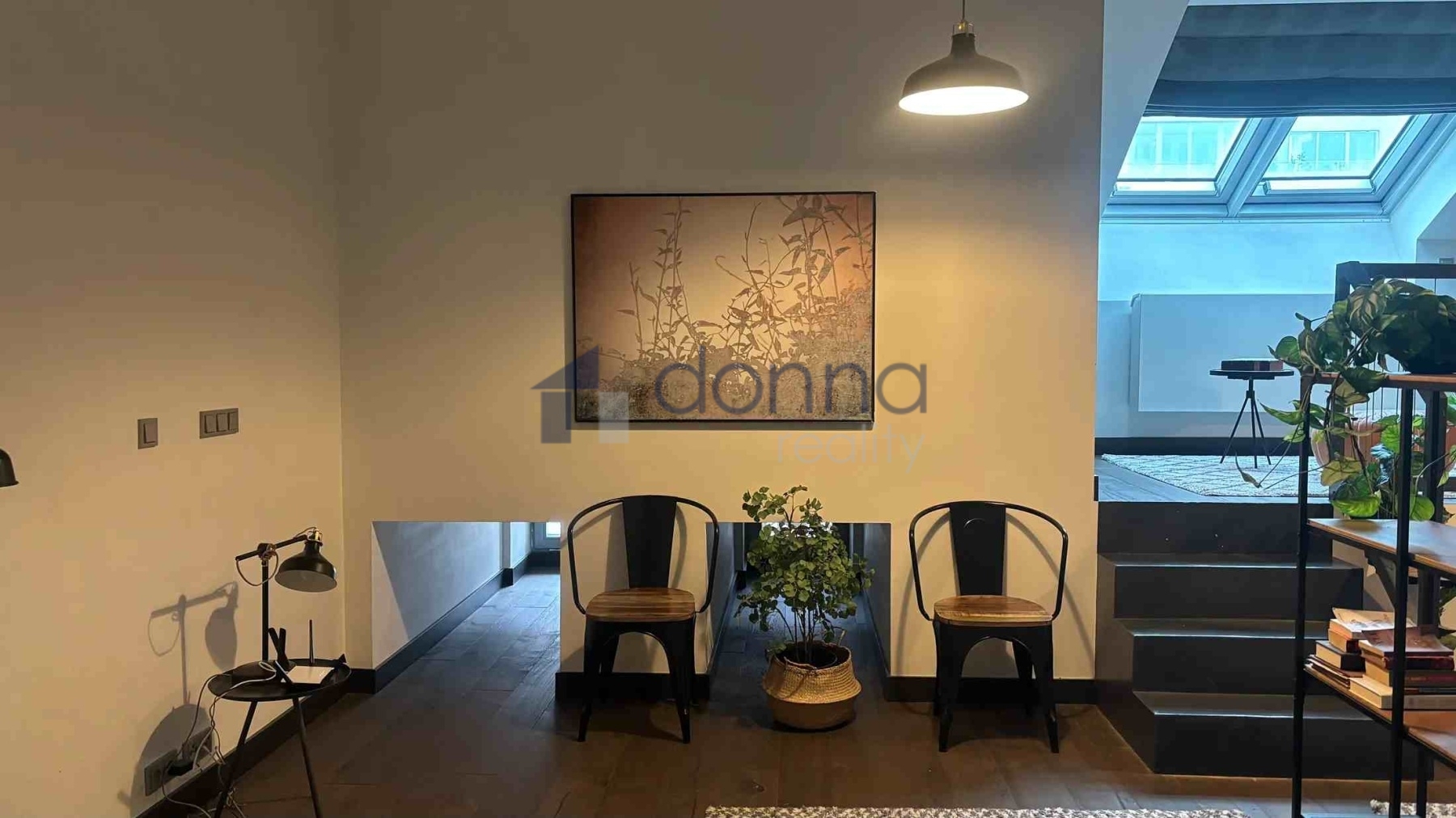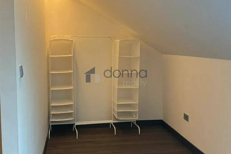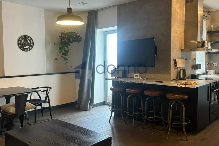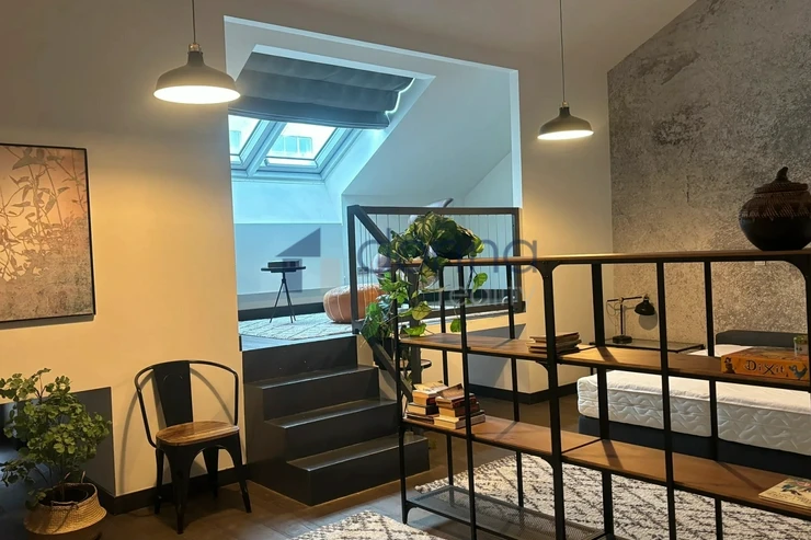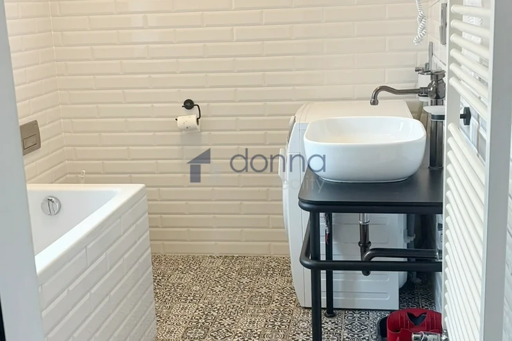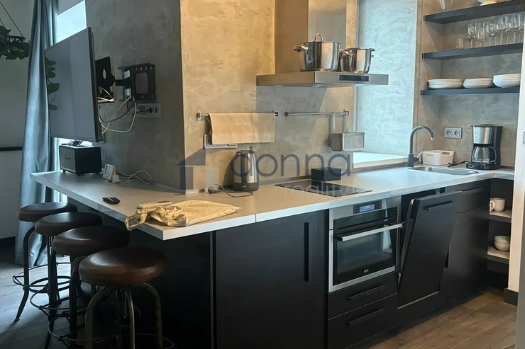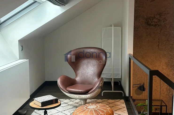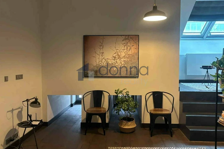 The apartment is entered through an entrance hall common to 4 apartments, which guarantees safety and silence. The apartment itself consists of a spacious hallway, a living room connected to a kitchen and dining area with a beautiful view through a large roof window that can be fully opened. The kitchen is fully equipped with appliances, a glass-ceramic hob, an electric oven, a microwave, a dishwasher and a fridge with a freezer. The bathroom with a window and a beautiful view has a large shower, a toilet with a bidet, a washing machine with a dryer is hidden in a closet. The bedroom has built-in wardrobes and an entrance to a large storage room. The entire apartment is air-conditioned. The windows of the apartment are situated on a quiet courtyard. The furnishings of the apartment correspond to the photos.