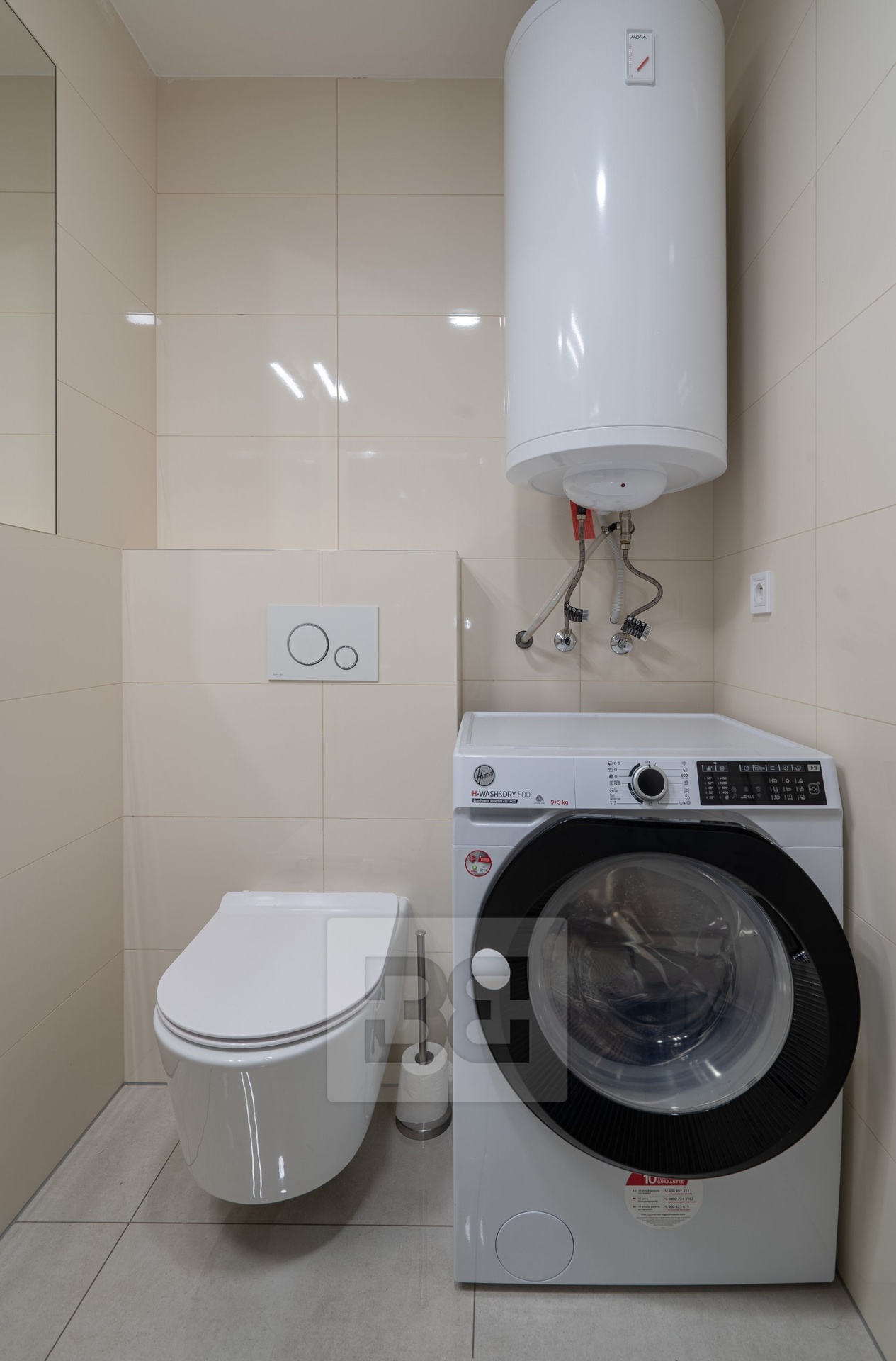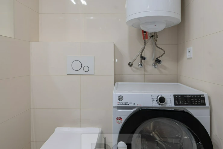 • Bathroom with shower, toilet, sink, and washing machine