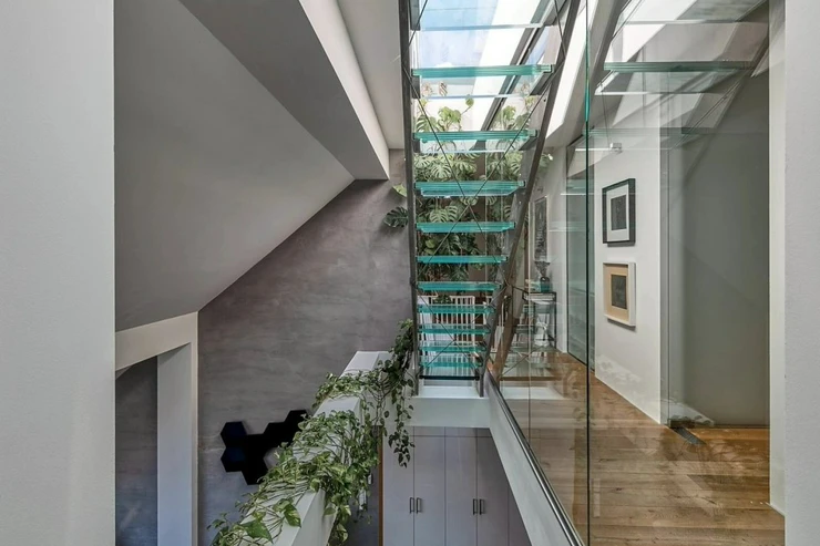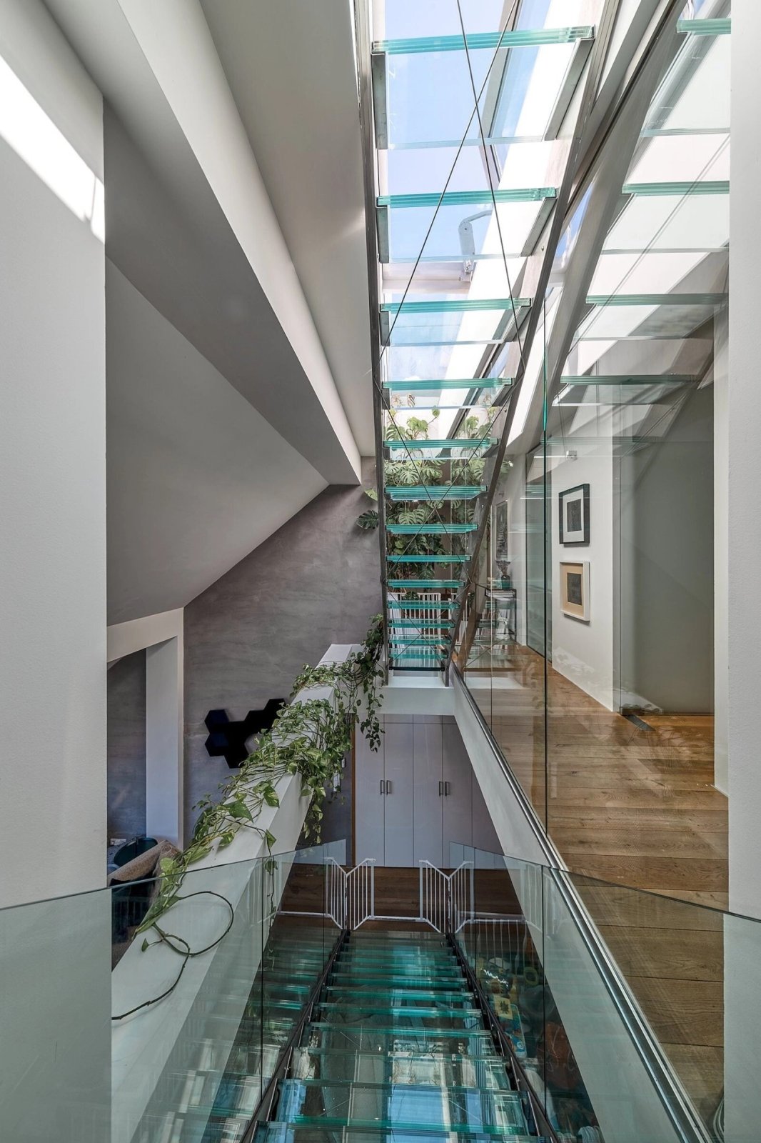The lower level features an impressive 101 sqm living and entertaining area with a suspended rotating fireplace and direct access to the terrace. The space includes a luxury kitchen fitted with built-in appliances.