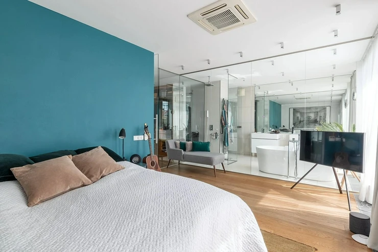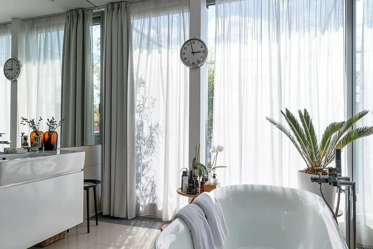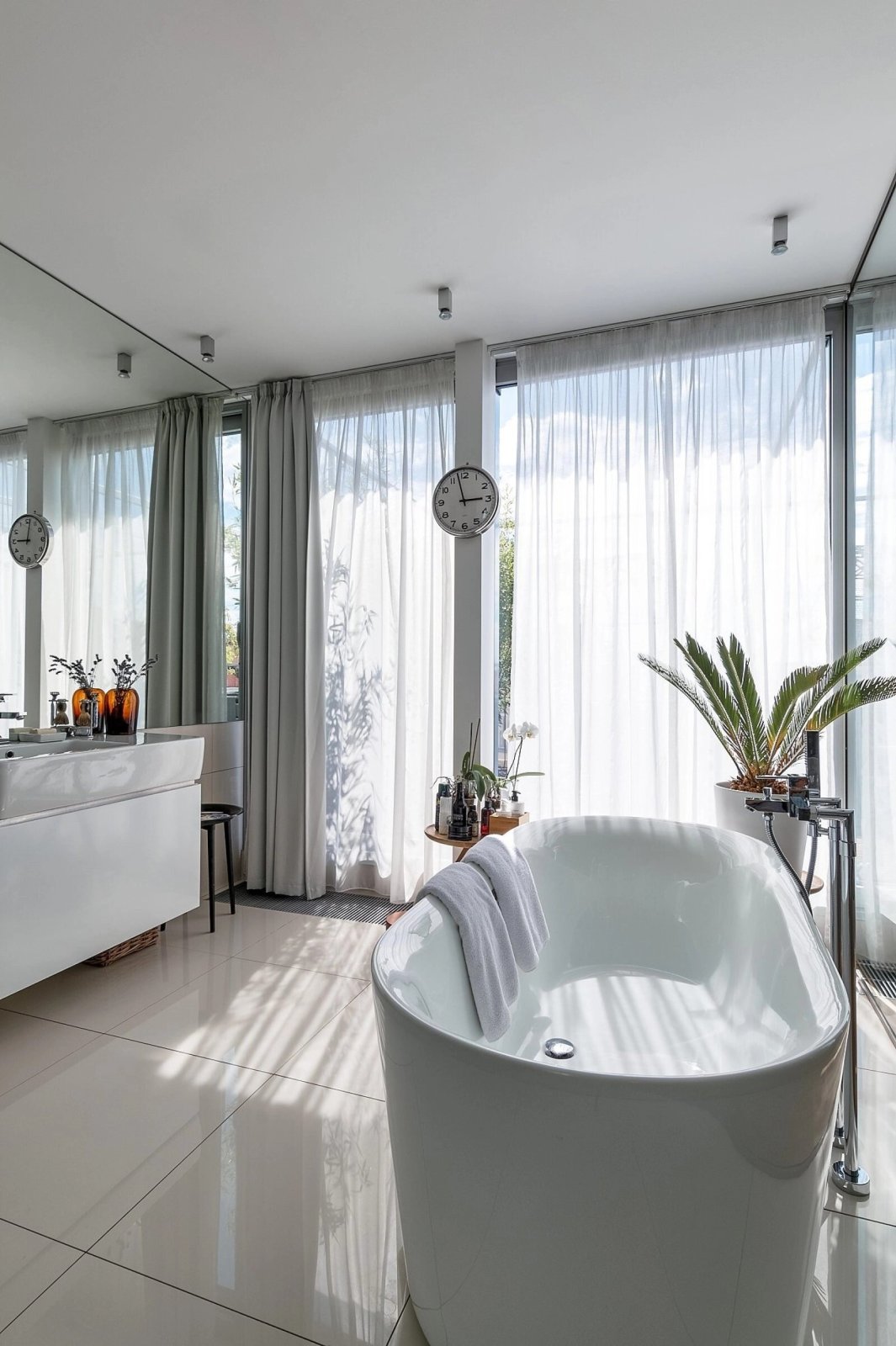 The upper floor offers three bedrooms, two bathrooms with bathtubs, a separate toilet, a spacious walk-in closet, and access to the rooftop terrace.