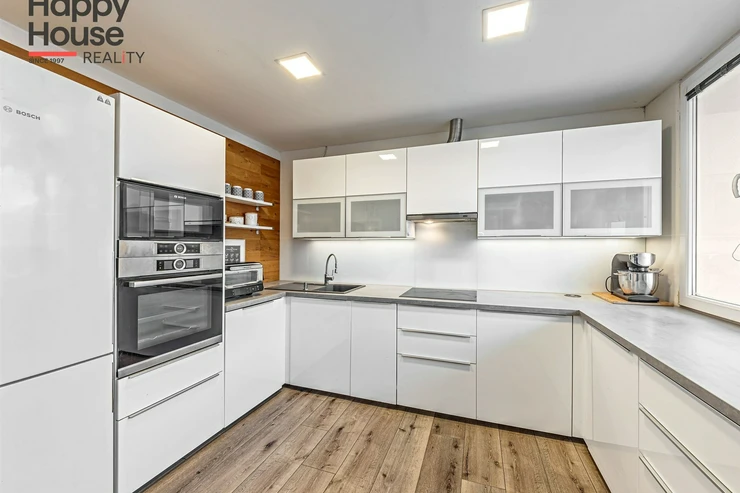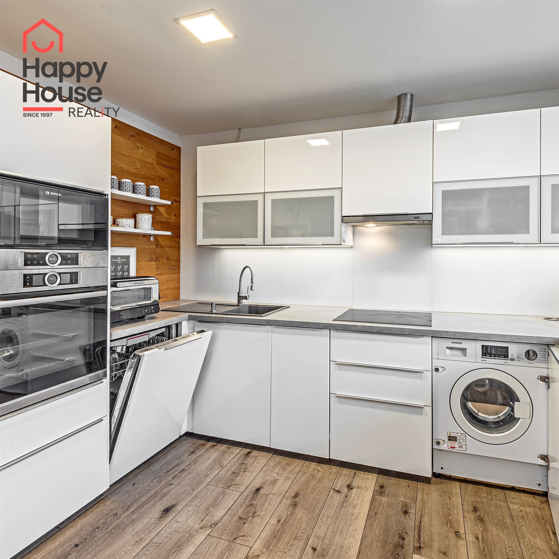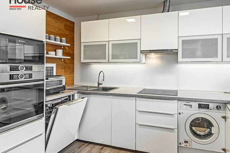The kitchen is equipped with a modern unit with built-in appliances – induction hob, extractor hood, electric steam oven, microwave oven, dishwasher, and a washer-dryer. The bathroom has a built-in shower. The floors are covered with high-quality vinyl flooring.