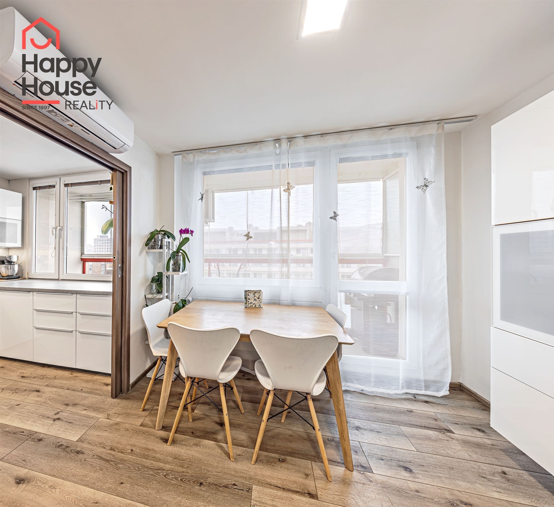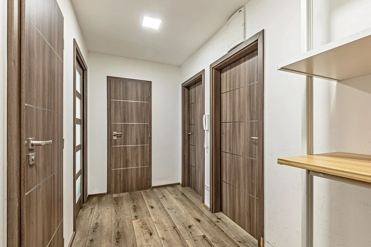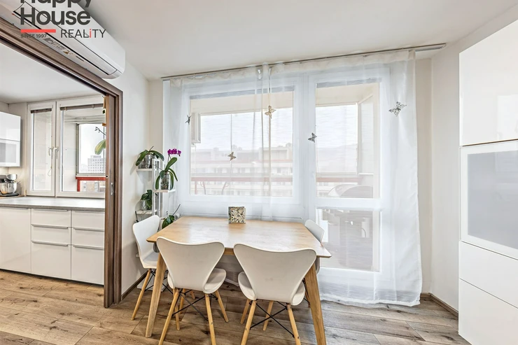 We exclusively offer for rent a partially furnished two-bedroom apartment with a floor area of 75.1 sqm, located on the 10th floor of a panel building with an elevator in the popular area of Prague 10 – Vršovice. Included in the rent is a kitchen unit with appliances, hallway and dressing room furnishings, and the rent also includes a television and internet connection from the Poda company, the other rooms are rented unfurnished.