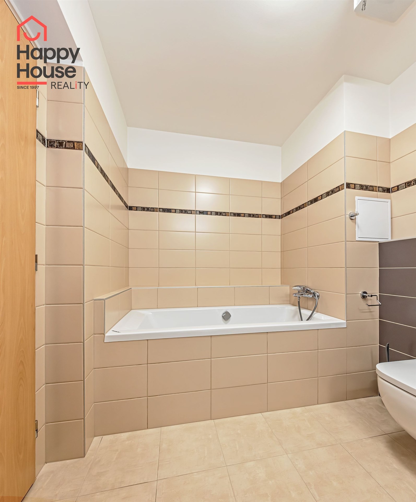 The apartment has 2 bathrooms, one with a bathtub and toilet and the other with a shower and toilet.