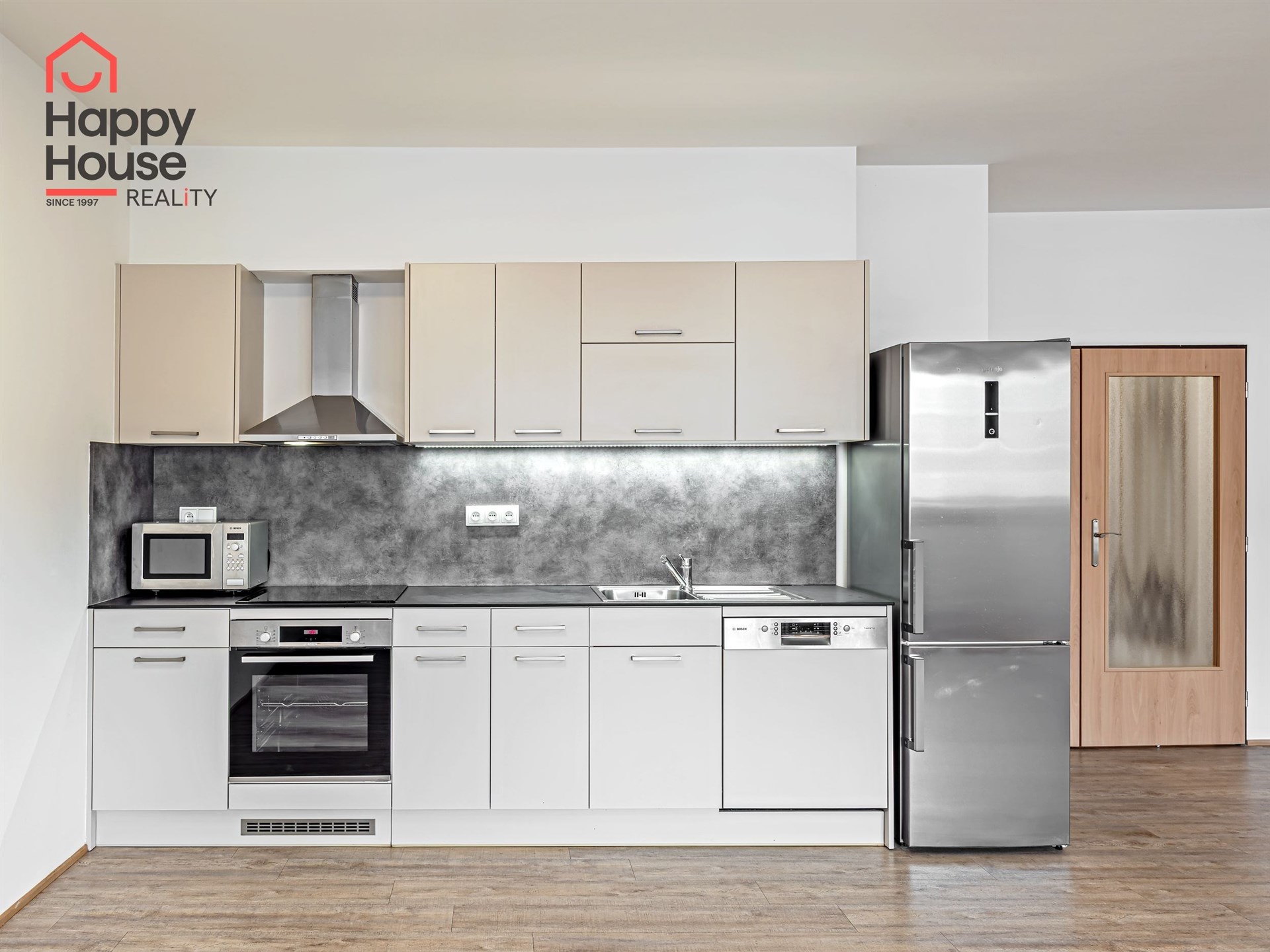 This recently renovated apartment has a living room connected to a fully equipped kitchen. The kitchen features modern appliances - built-in oven, stove, microwave oven, refrigerator with freezer, and dishwasher.