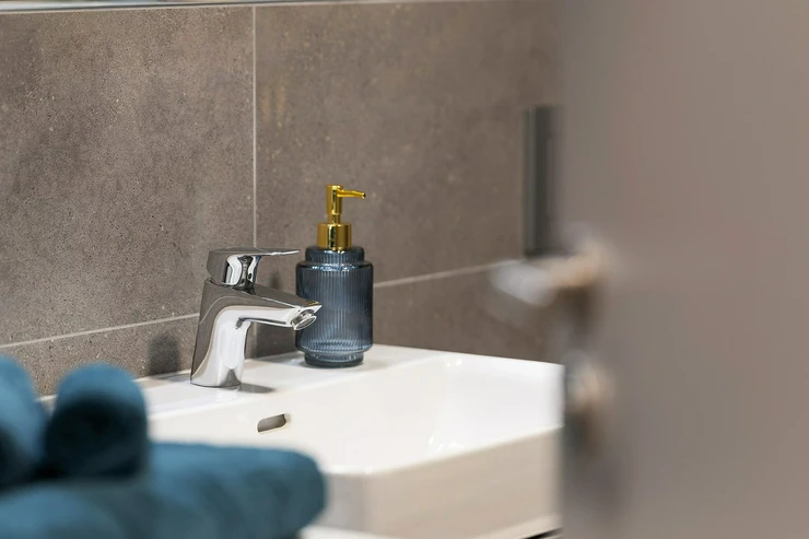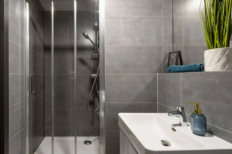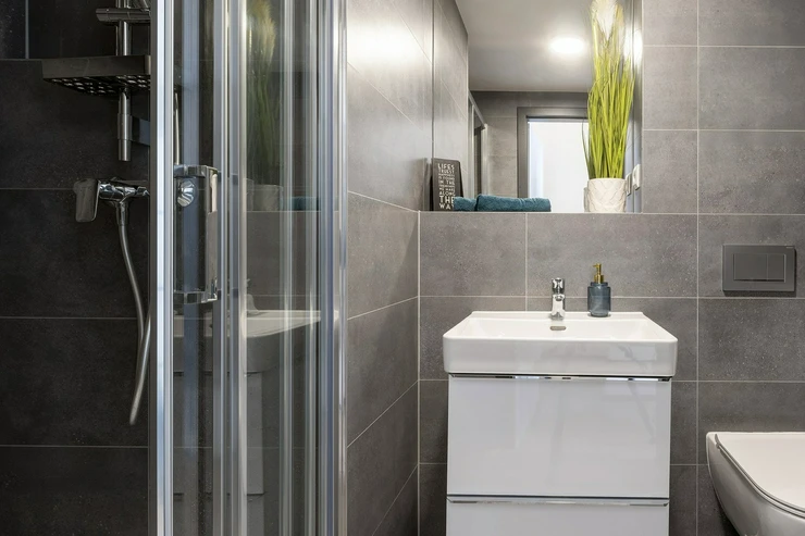 The bathroom is modern, fresh, and shower-ready.