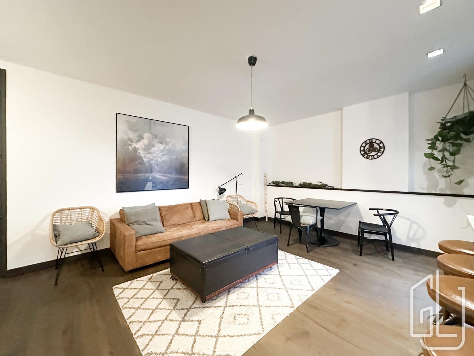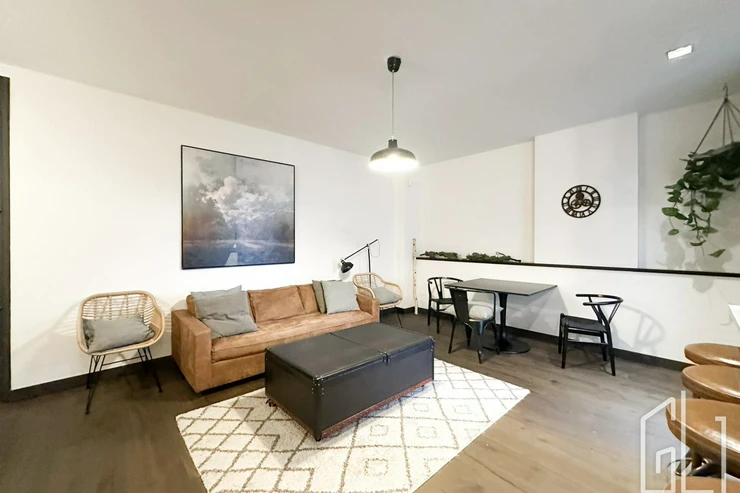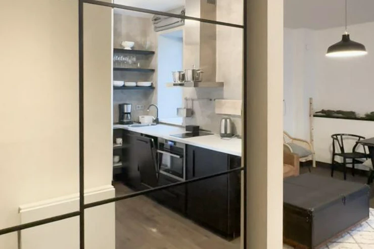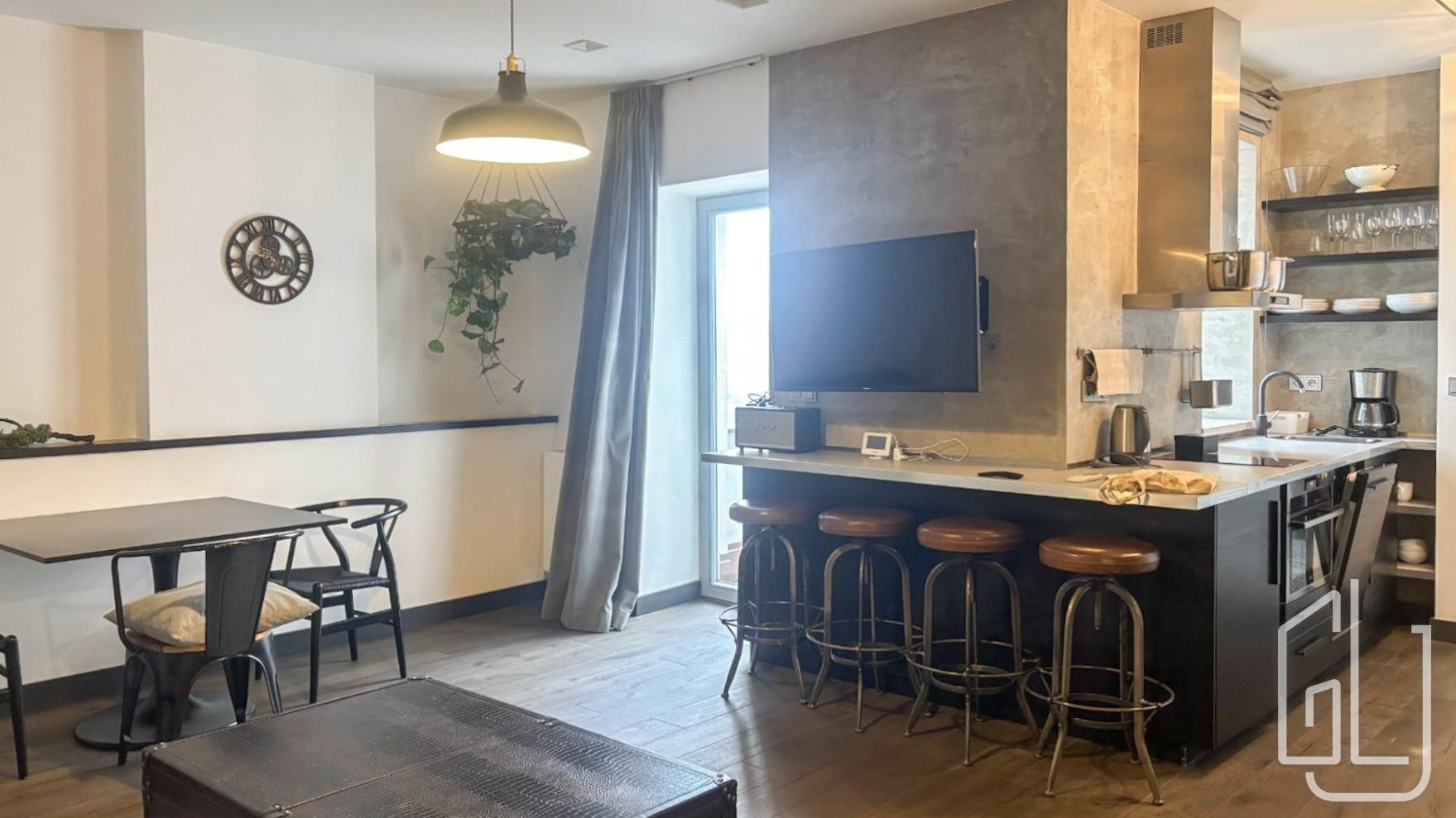 The apartment consists of a spacious living room with a kitchen and dining area, a bedroom, a bathroom, and a balcony. The kitchen is equipped with appliances - refrigerator, dishwasher, induction hob, extractor hood, electric kettle, and coffee machine.