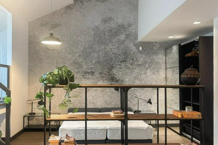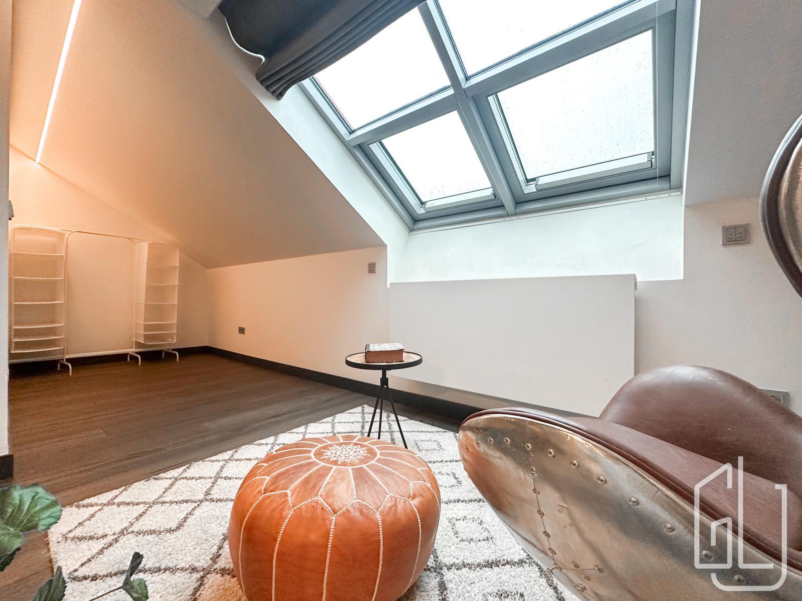 The living room is furnished with a sofa, TV stand, and wall-mounted TV. The bedroom has a double bed and a large wardrobe. The apartment also features a raised loft area that can be used as a workspace, relaxation zone, or storage. The balcony is accessible from the living room.