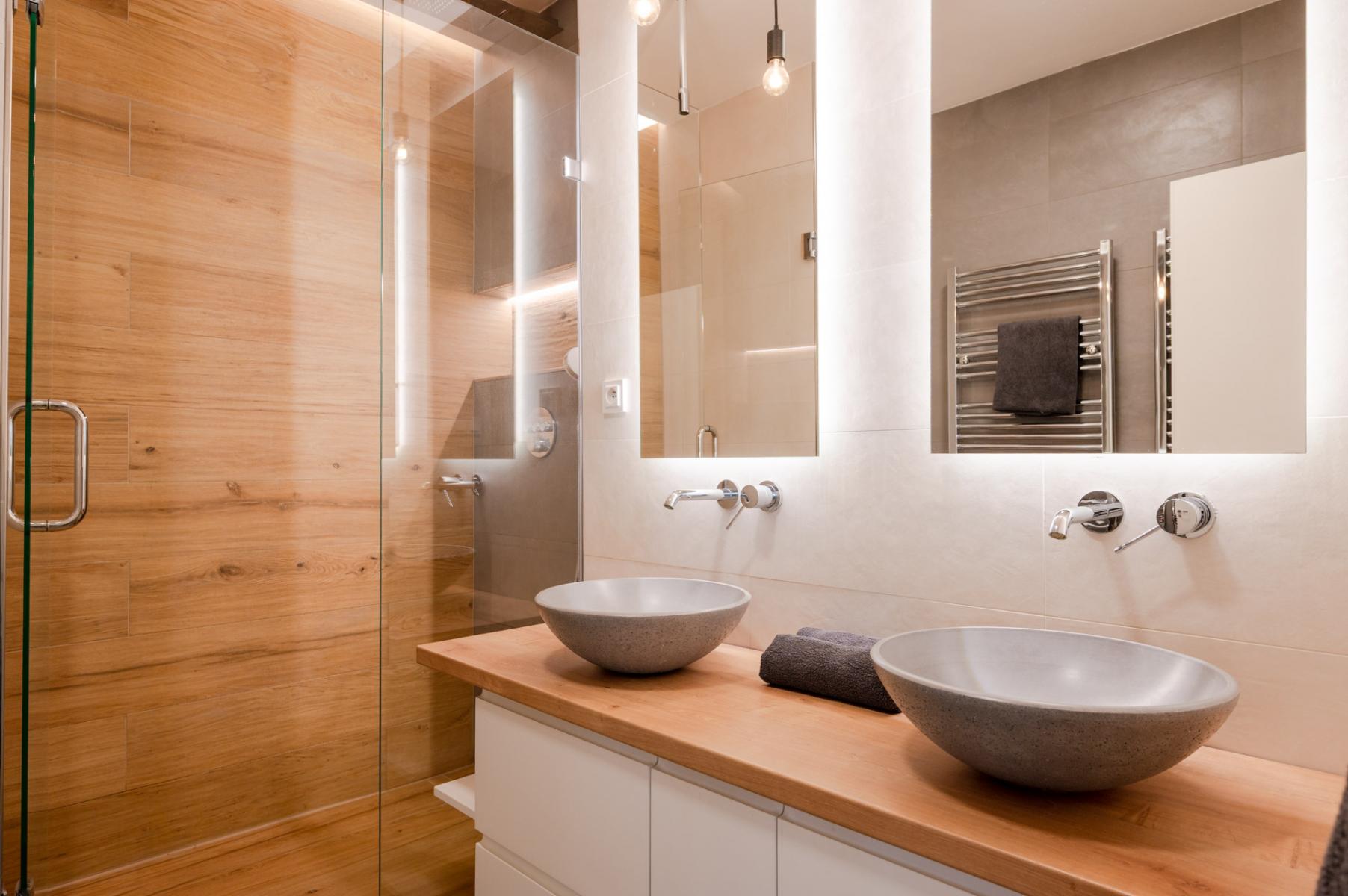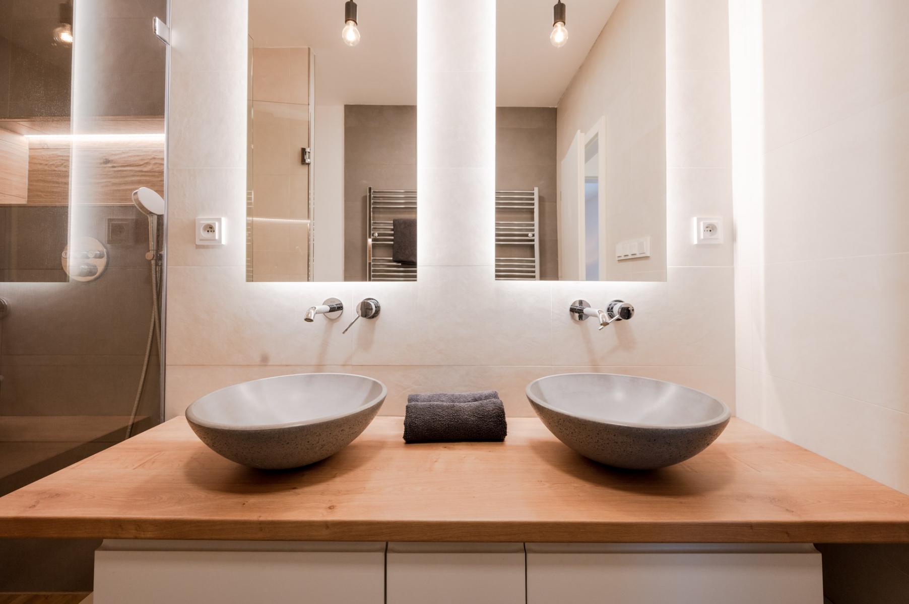 Úložných prostor je více než dostatek (velká vestavěná skříň v hale a další v hlavní ložnici). Moderní kuchyňská linka disponuje, mimo úložné možnosti, také velkou pracovní plochou, ambientním osvětlením a vestavěnými spotřebiči (myčkou, lednicí, mrazákem, troubou, varnou deskou a digestoří). Koupelna je další ze skvěle provedených prostor bytu, je vybavena sprchovým koutem, pračkou, dvěma umyvadly a podsvícenými zrcadly. Toaleta je samostatná. Veškeré vybavení, které vidíte na přiložených aktuálních fotografiích, je součástí pronájmu. Okna se žaluziemi směřují na dvě světové strany (východ a západ).