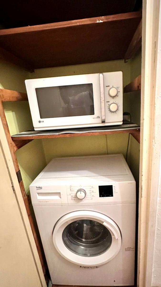 The apartment features a spacious living room with access to the balcony, one separate bedroom, a separate kitchen with a stove and dishes, a bathroom with a corner bathtub, a separate toilet, and a hallway with plenty of storage space. A washing machine and microwave are also available.