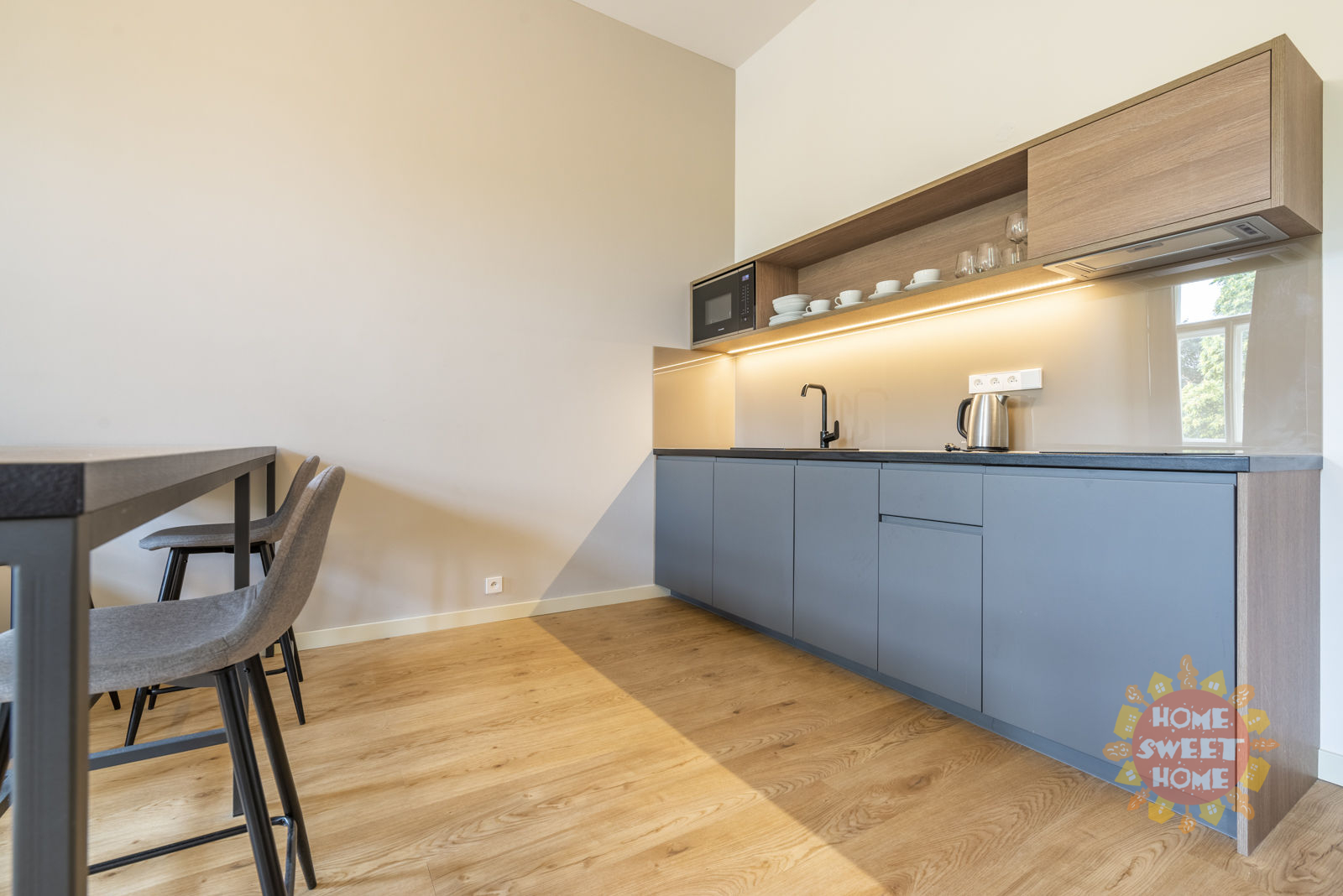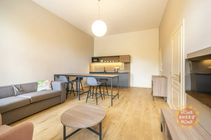 The apartment consists of a living room with a fully equipped kitchenette and a double bed, as well as a bathroom with a shower and toilet. The building has a 24/7 reception and a laundry room. The fees include utilities, high-speed Wi-Fi, 68 TV channels, waste collection, cleaning of common areas, and reception services. Additional services such as regular cleaning, bed linen change, and organic bathroom cosmetics can also be provided for an extra charge.