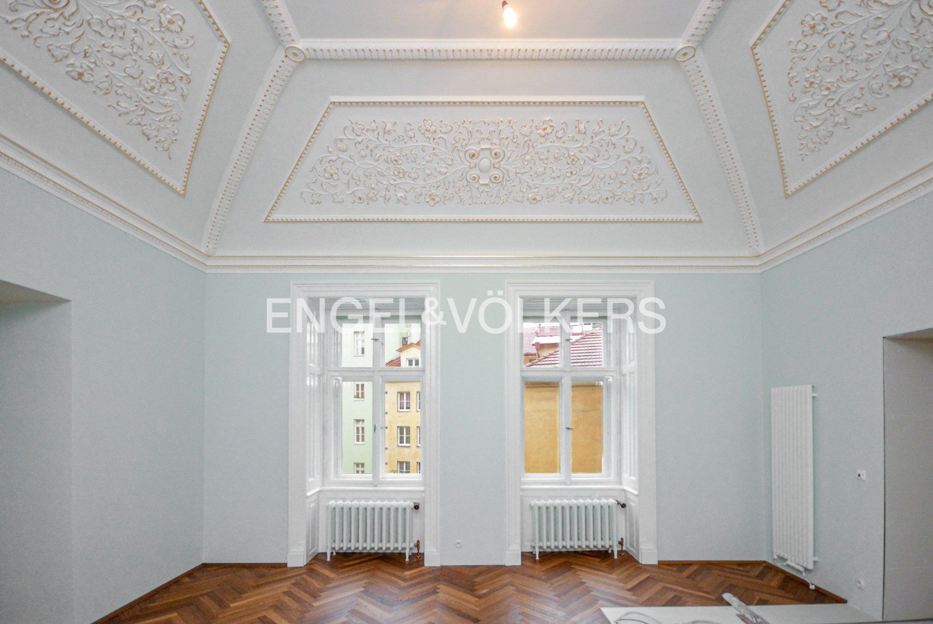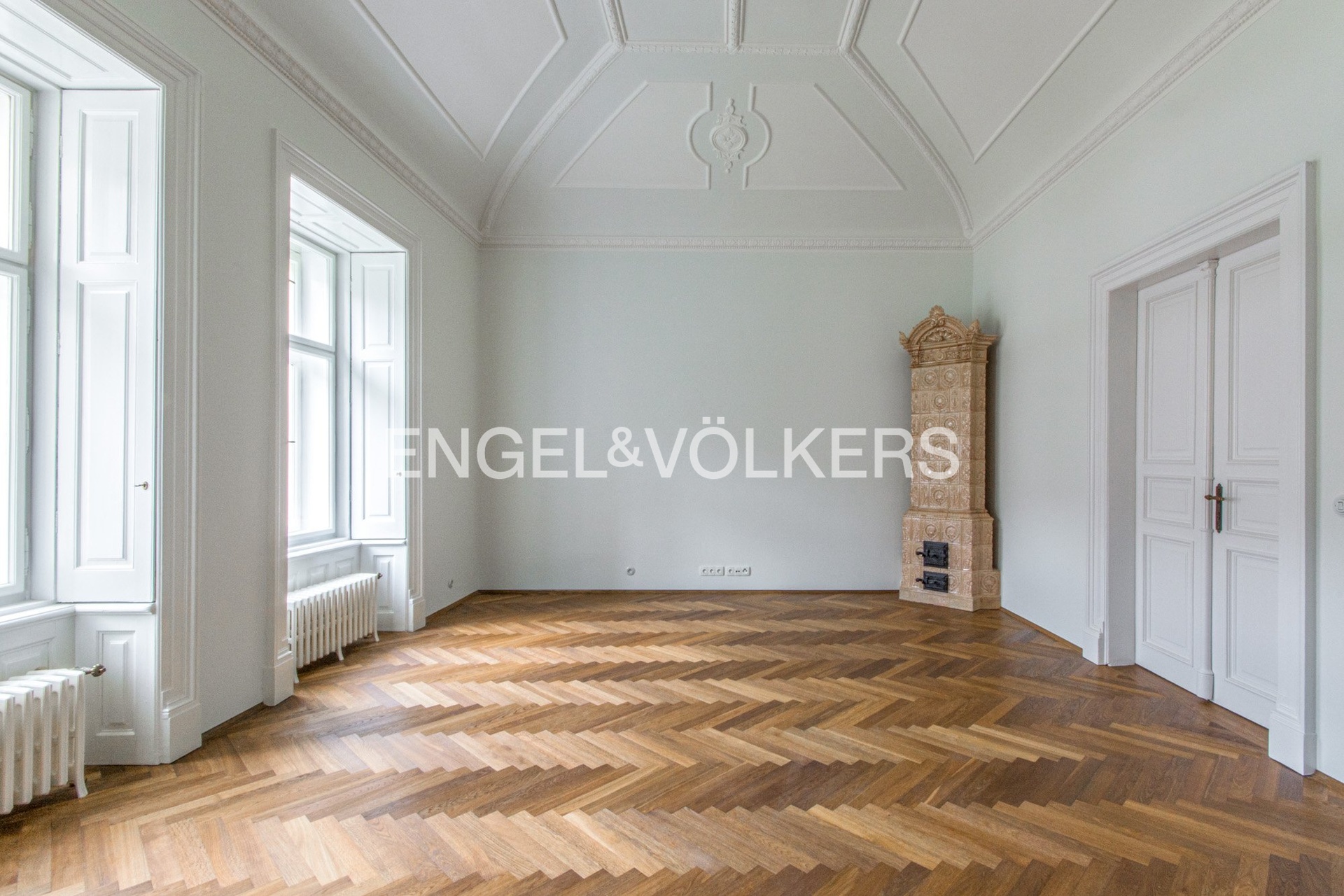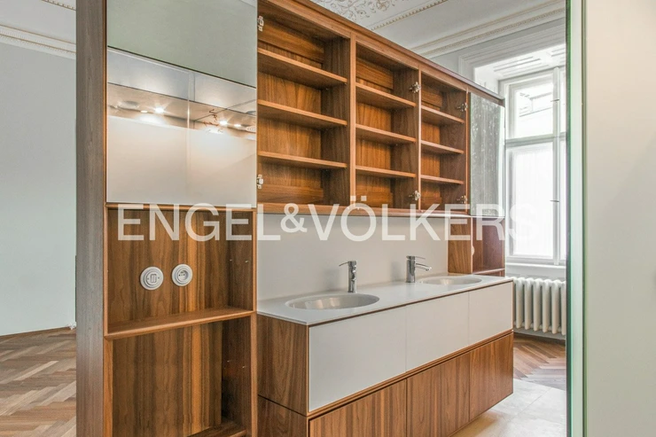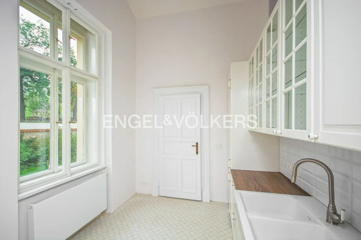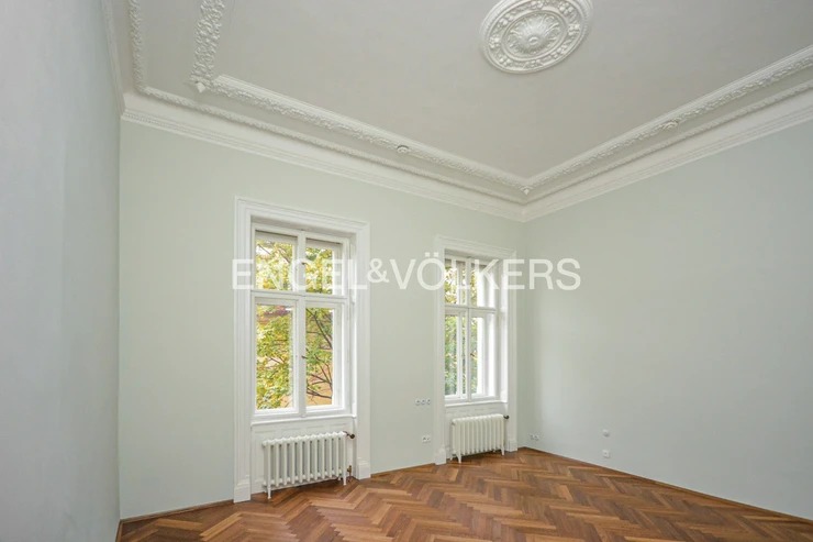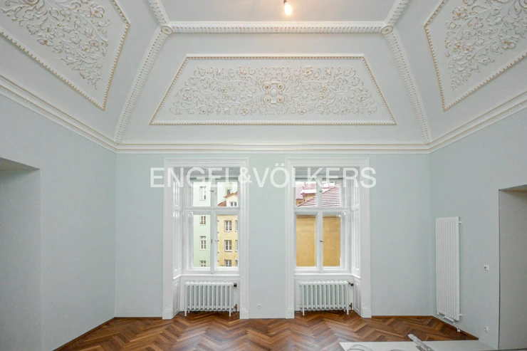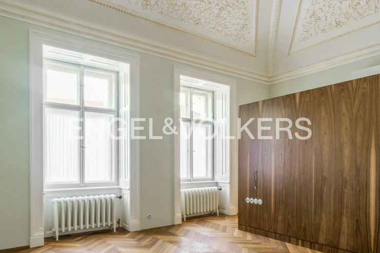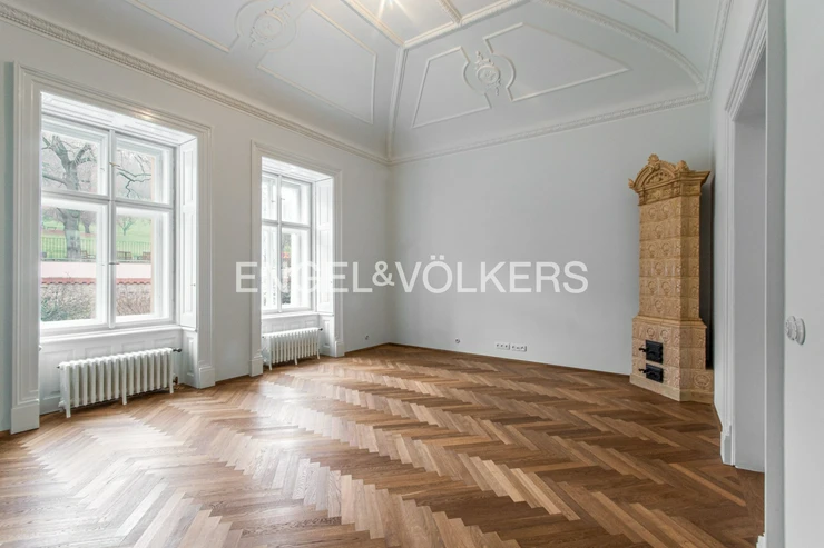 The interior has retained its original historical features – decorated and gilded ceilings, tiled stoves, and double doors. The apartment also offers parquet floors, stylish radiators and ceramic switches in a historical design, built-in wardrobes, refurbished windows, and interior shutters. Heating is provided by its own gas boiler.