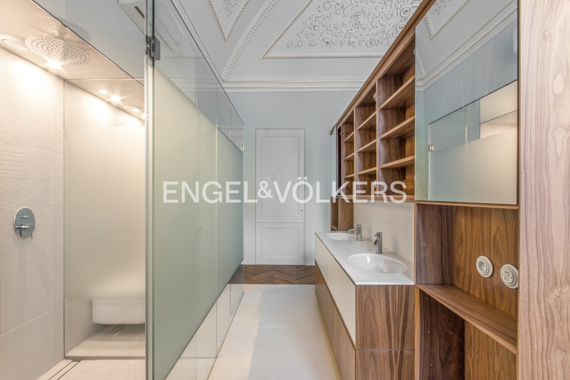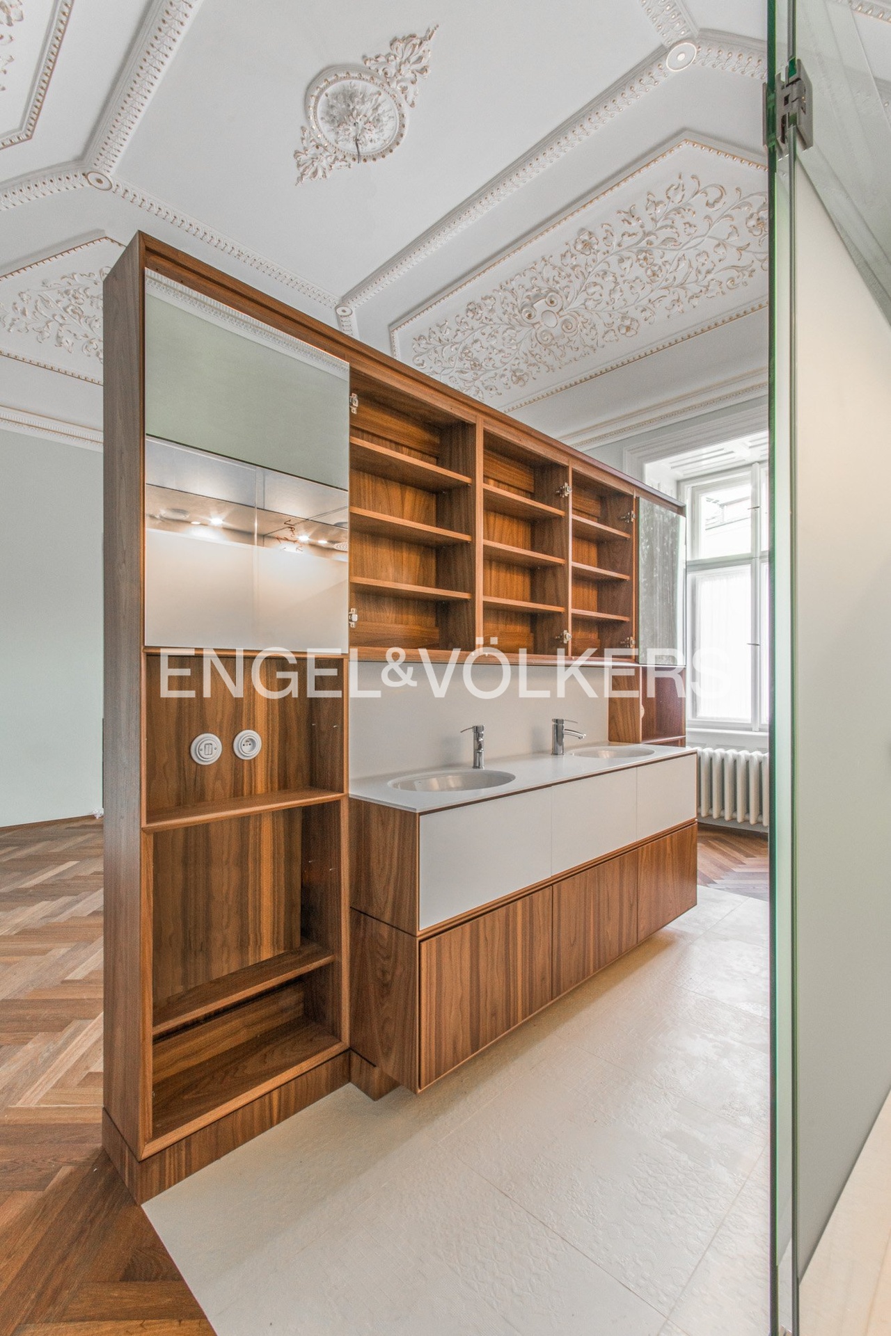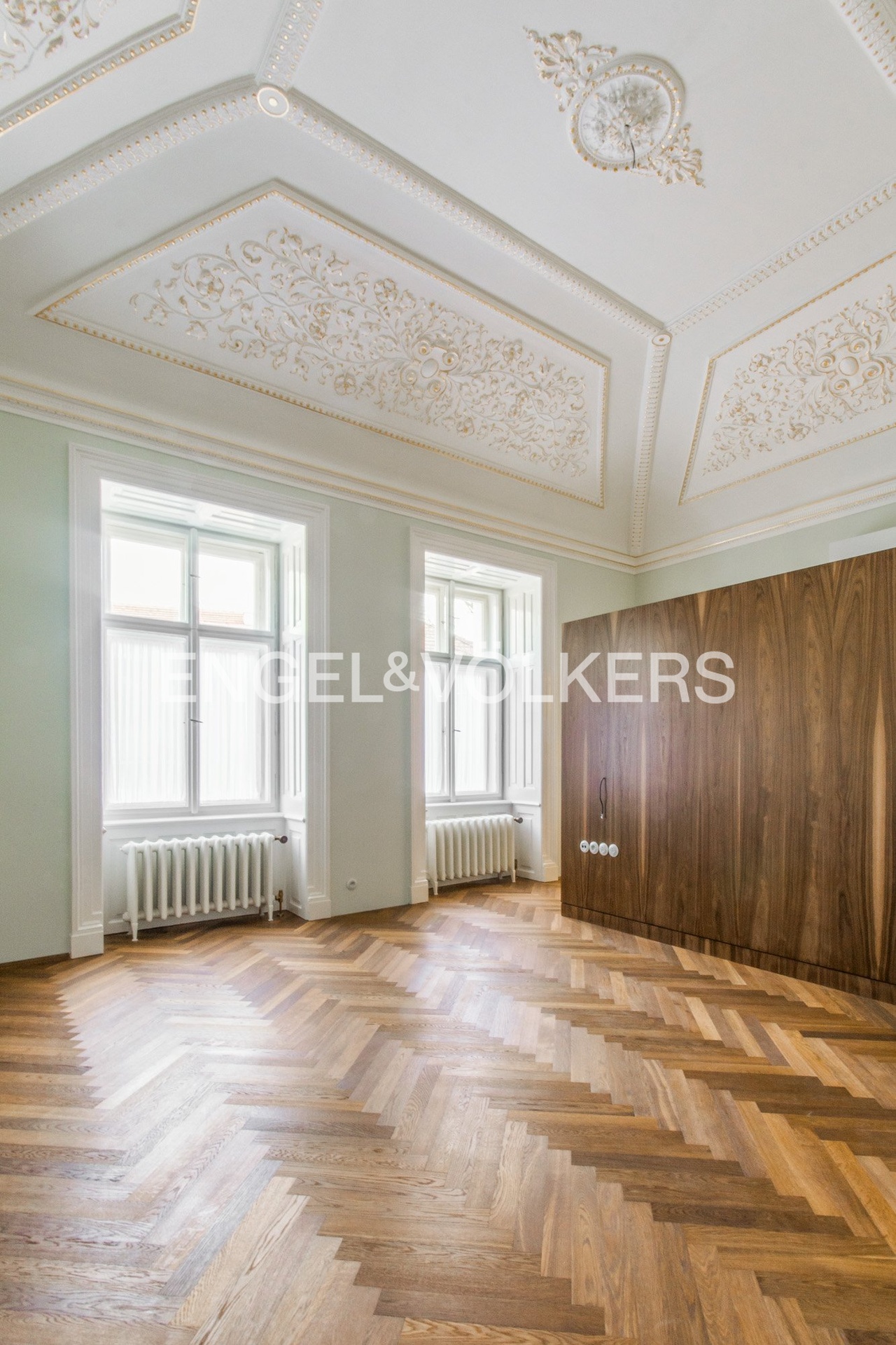 The interior has retained its original historical features – decorated and gilded ceilings, tiled stoves, and double doors. The apartment also offers parquet floors, stylish radiators and ceramic switches in a historical design, built-in wardrobes, refurbished windows, and interior shutters. Heating is provided by its own gas boiler.